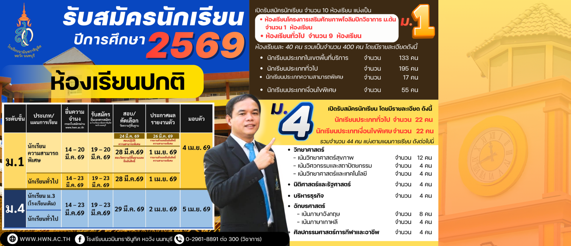 ประกาศ การรับนักเรียนชั้นมัธยมศึกษาปีที่ 1 และชั้นมัธยมศึกษาปีที่ 4 ปีการศึกษา 2569