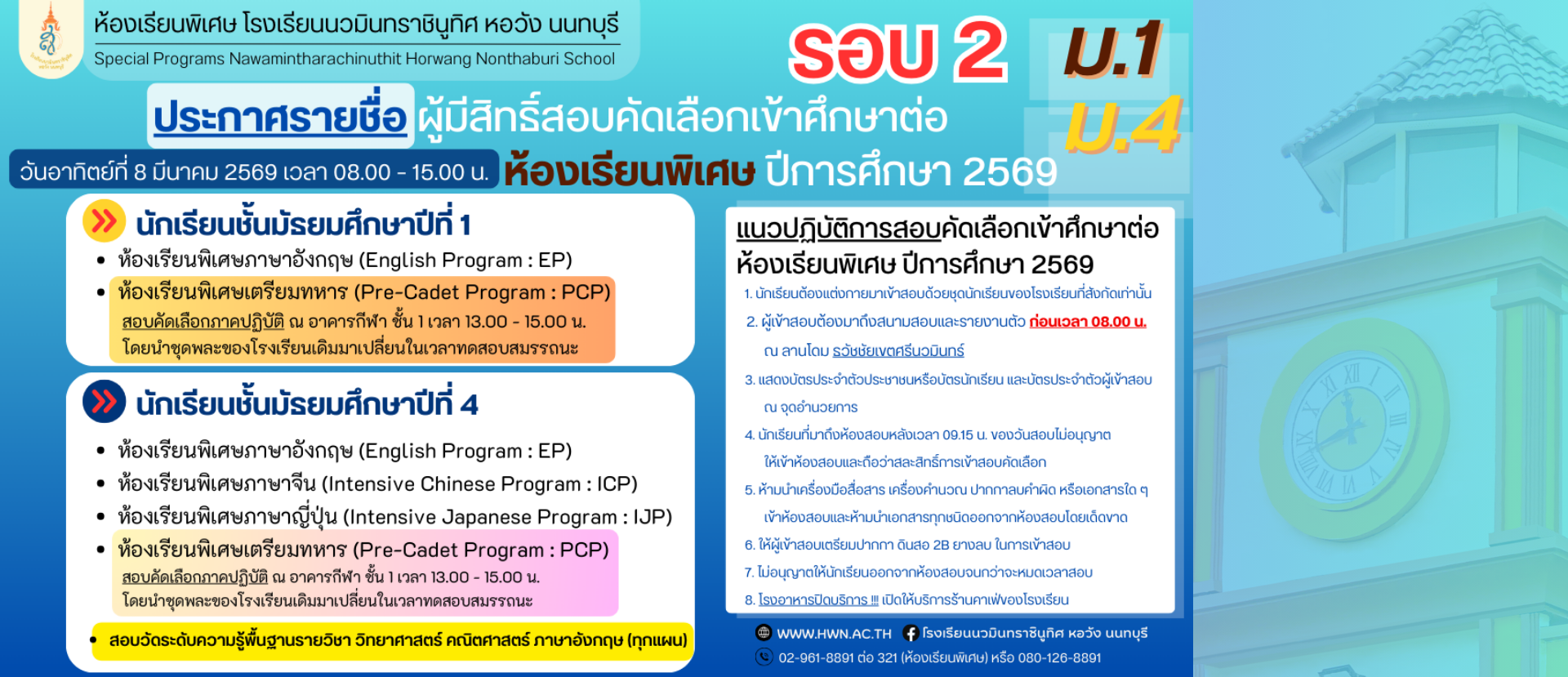 ประกาศ การรับสมัครสอบคัดเลือกเข้าศึกษาต่อห้องเรียนพิเศษ ปีการศึกษา 2569 ระดับชั้นมัธยมศึกษาปีที่ 1 และระดับชั้นมัธยมศึกษาปีที่ 4 (เพิ่มเติม)
