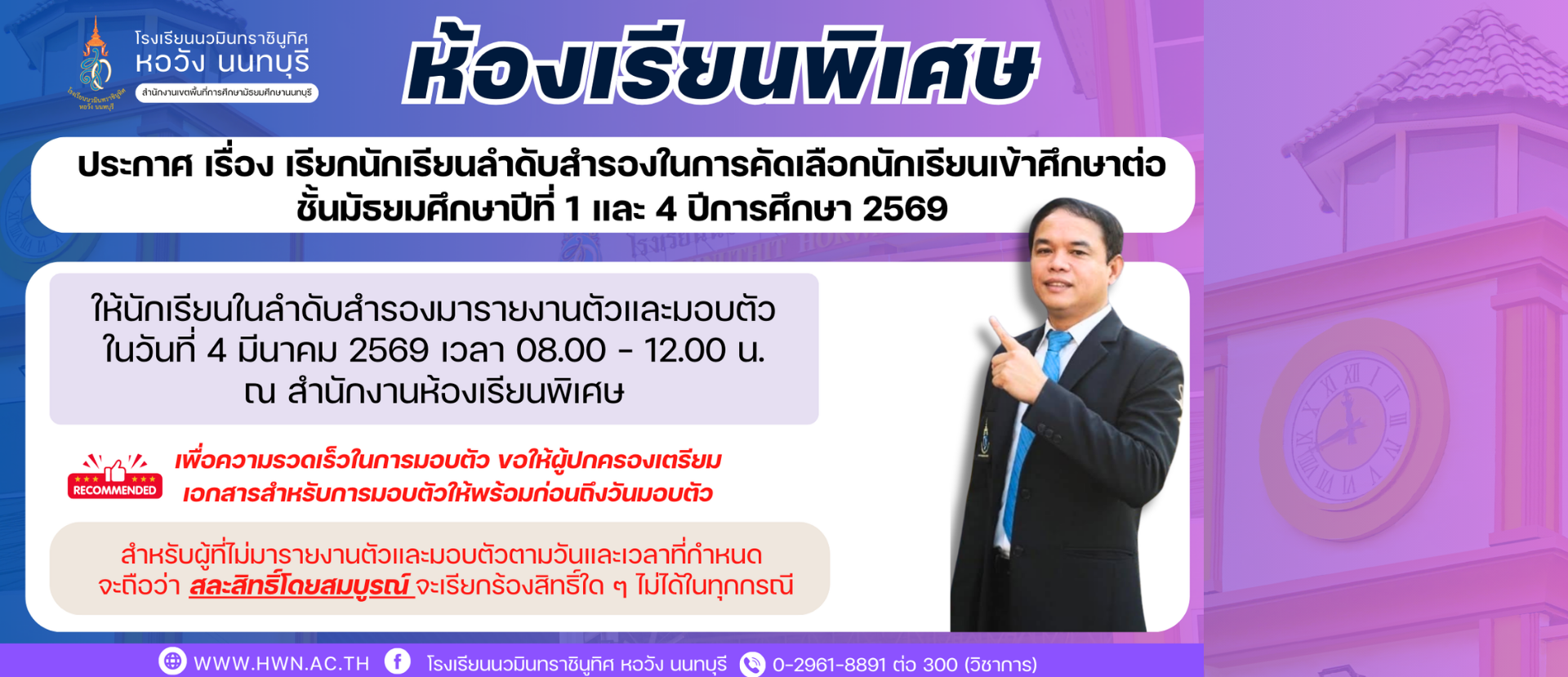 ประกาศ เรื่อง เรียกนักเรียนลำดับสำรองในการคัดเลือกนักเรียนเข้าศึกษาต่อชั้นมัธยมศึกษาปีที่ 1 และ 4 ห้องเรียนพิเศษ ปีการศึกษา 2569