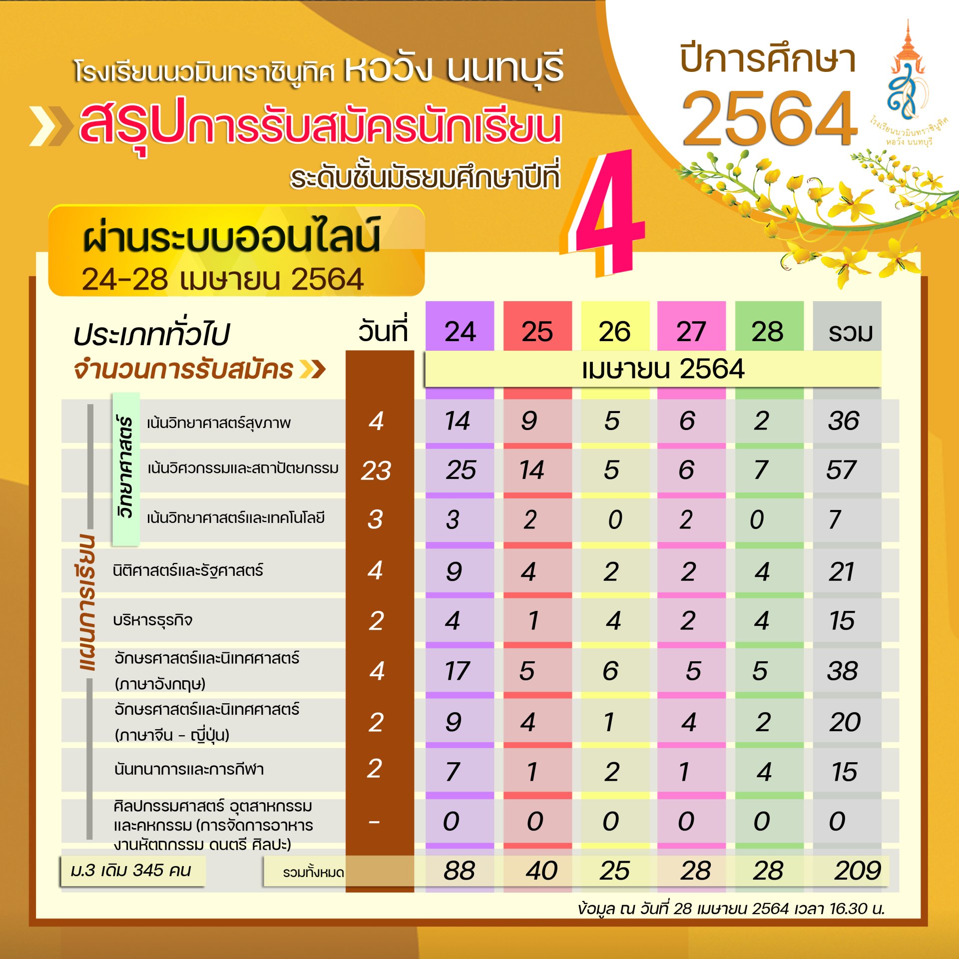 จำนวนการรับสมัครในระดับชั้นมัธยมศึกษาปีที่ 4 แต่ละแผนการเรียน 1. แผนการเรียนวิทยาศาสตร์เน้นวิทยาศาสตร์สุขภาพ รับจำนวน 4 คน 2. แผนการเรียนวิทยาศาสตร์เน้นวิศวกรรมและสถาปัตยกรรม • เน้นวิศวกรรม รับจำนวน 6 คน • เน้นสถาปัตยกรรม รับจำนวน 17 คน 3. แผนการเรียนวิทยาศาสตร์เน้นวิทยาศาสตร์และเทคโนโลยี รับจำนวน 3 คน 4. แผนการเรียนนิติศาสตร์และรัฐศาสตร์ รับจำนวน 4 คน 5. แผนการเรียนบริหารธุรกิจ รับจำนวน 2 คน 6. แผนการเรียนอักษรศาสตร์และนิเทศศาสตร์ • ภาษาอังกฤษ รับจำนวน 4 คน • ภาษาจีน-ญี่ปุ่น รับจำนวน 2 คน 7. แผนการเรียนนันทนาการและการกีฬา รับจำนวน 2 คน 8. แผนการเรียนศิลปกรรมศาสตร์ อุตสาหกรรม และคหกรรม รับจำนวน - คน (การจัดการอาหาร งานหัตถกรรม ดนตรี ศิลปะ) |