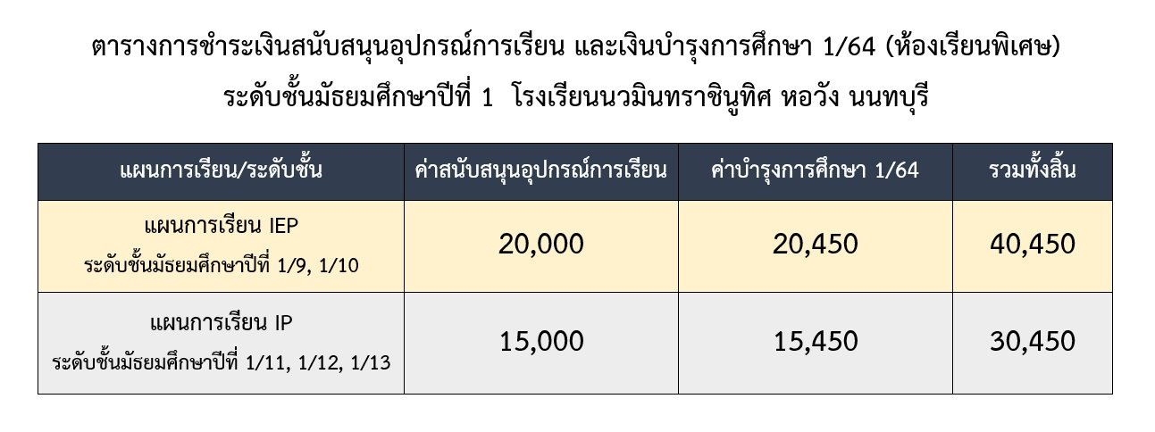 เนื่องจากสถานการณ์การแพร่ระบาดของโรค Covid-19 ระลอกที่ 3 โรงเรียนนวมินทราชินูทิศ หอวังนนทบุรี จึงขอประกาศเพิ่มเติมเกี่ยวกับกำหนดการการรับรายงานตัว มอบตัวและชำระเงินของนักเรียนที่ผ่านการสอบคัดเลือกเข้าศึกษาต่อระดับชั้นมัธยมศึกษาปีที่ 1 และชั้นมัธยมศึกษาปีที่ 4 โครงการห้องเรียนพิเศษ ปีการศึกษา 2564 รายละเอียดดังนี้