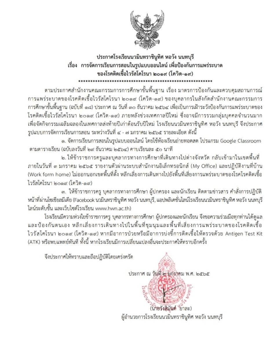 จัดการเรียนการสอนในรูปแบบออนไลน์ โดยใช้ห้องเรียนถ่ายทอดสดผ่าน Google Classroom ตามตารางเรียน (ฉบับลงวันที่ 29 ธ.ค. 64) คาบเรียนละ 50 นาที