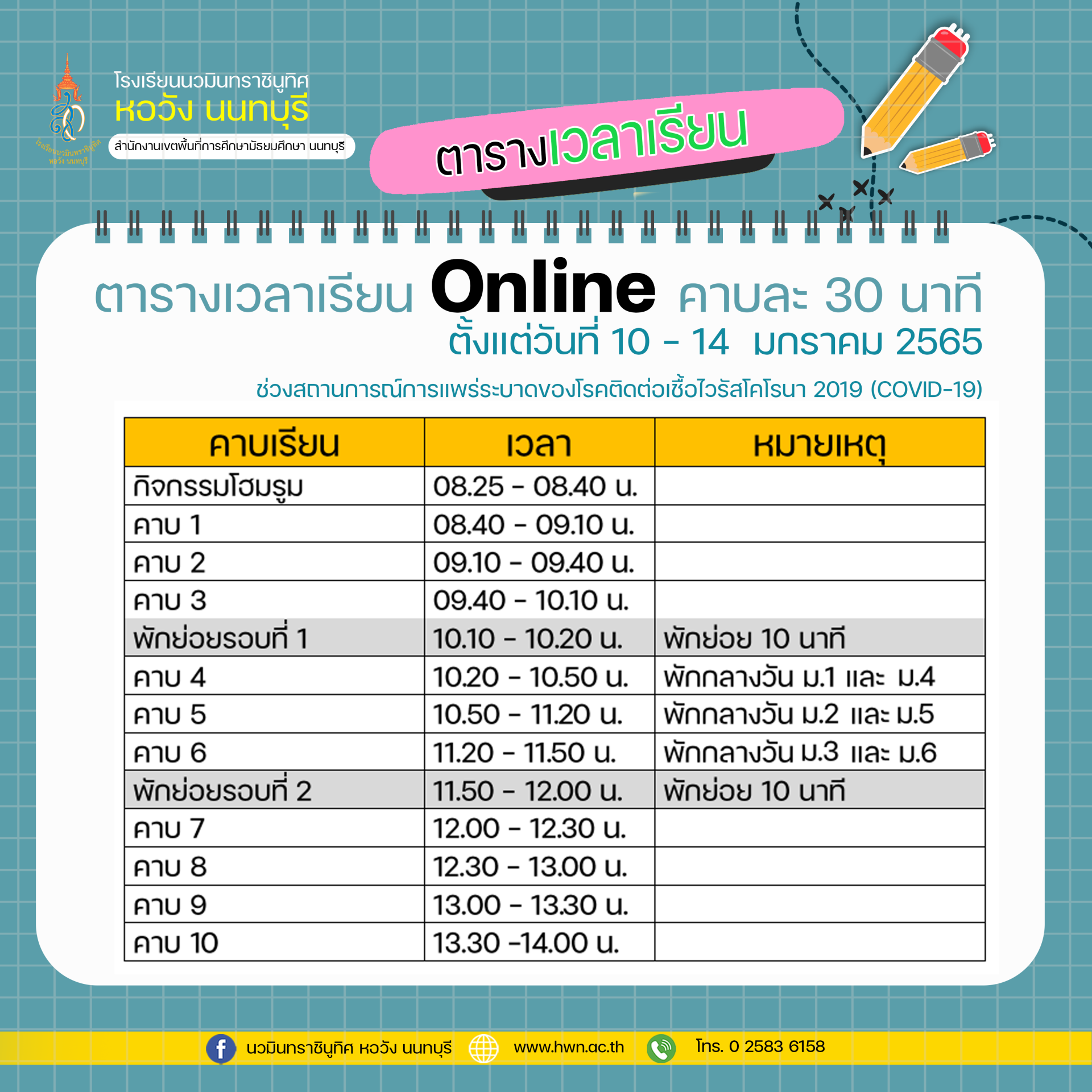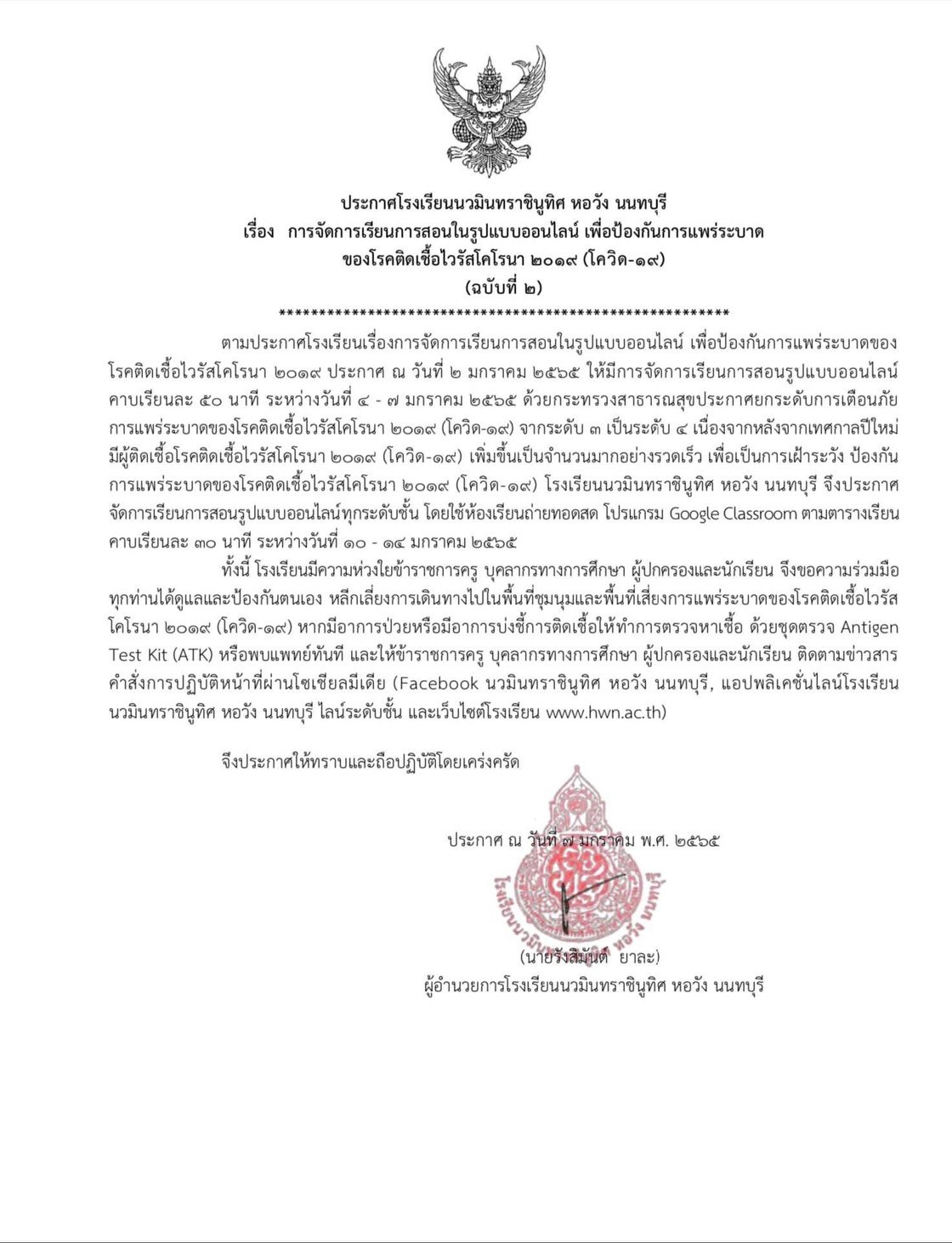 ตามประกาศโรงเรียนเรื่องการจัดการเรียนการสอนในรูปแบบออนไลน์ เพื่อป้องกันการแพร่ระบาดของโรคติดเชื้อไวรัสโคโรนา ๒๐๑๙ ประกาศ ณ วันที่ ๒ มกราคม ๒๕๖๕ ให้มีการจัดการเรียนการสอนรูปแบบออนไลน์คาบเรียนละ ๕๐ นาทีระหว่างวันที่ ๔ - ๗ มกราคม ๒๕๖๕ ด้วยกระทรวงสาธารณสุขประกาศยกระดับการเตือนภัยการแพร่ระบาดของโรคติดเชื้อไวรัสโคโรนา ๒๐๑๙ (โควิด-๑๙) จากระดับ ๓ เป็นระดับ ๔ เนื่องจากหลังจากเทศกาลปีใหม่มีผู้ติดเชื้อโรคติดเชื้อไวรัสโคโรนา ๒๐๑๙ (โควิด-๑๙) เพิ่มขึ้นเป็นจำนวนมากอย่างรวดเร็ว เพื่อเป็นการเฝ้าระวัง ป้องกันการแพร่ระบาดของโรคติดเชื้อไวรัสโคโรนา ๒๐๑๙ (โควิด-๑๙) โรงเรียนนวมินทราชินูทิศ หอวัง นนทบุรี จึงประกาศจัดการเรียนการสอนรูปแบบออนไลน์ทุกระดับชั้น โดยใช้ห้องเรียนถ่ายทอดสด โปรแกรม Google Classroom ตามตารางเรียน คาบเรียนละ ๓๐ นาที ระหว่างวันที่ ๑๐ - ๑๔ มกราคม ๒๕๖๕