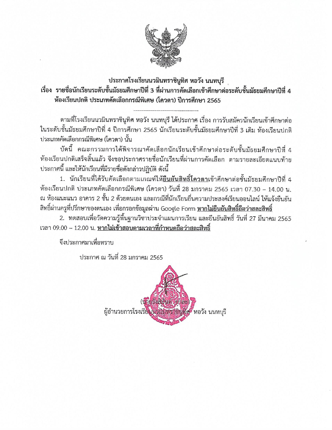 1. นักเรียนที่ได้รับคัดเลือกตามเกณฑ์ให้ยืนยันสิทธิ์โควตาเข้าศึกษาต่อชั้นมัธยมศึกษาปีที่ 4 ห้องเรียนปกติ ประเภทคัดเลือกกรณีพิเศษ (โควตา) วันที่ 28 มกราคม 2565 เวลา 07.30 - 14.00 น. ณ ห้องแนะแนว อาคาร 2 ชั้น 2 ด้วยตนเอง และกรณีที่นักเรียนยื่นความประสงค์เรียนออนไลน์ ให้แจ้งยืนยัน สิทธิ์ผ่านครูที่ปรึกษาของตนเอง เพื่อกรอกข้อมูลผ่าน Google Form หากไม่ยืนยันสิทธิ์ถือว่าสละสิทธิ์