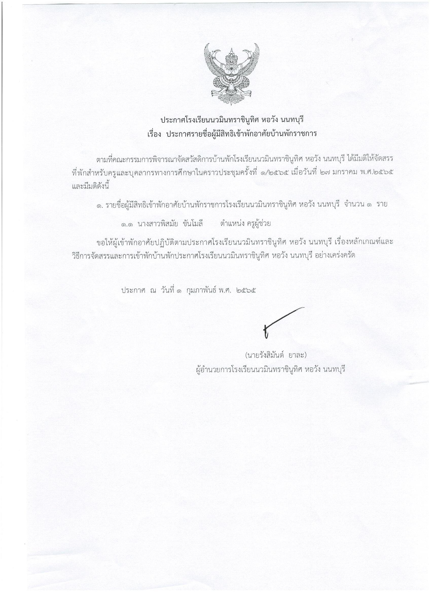 ตามที่คณะกรรมการพิจารณาจัดสวัสดิการบ้านพักโรงเรียนนวมินทราชินูทิศ หอวัง นนทบุรี ได้มีมติให้จัดสรรที่พักสำหรับครูและบุคลากรทางการศึกษาในคราวประชุมครั้งที่ 1/2564 เมื่อวันที่ 27 มกราคม พ.ศ.2565 และมีมติดังนี้