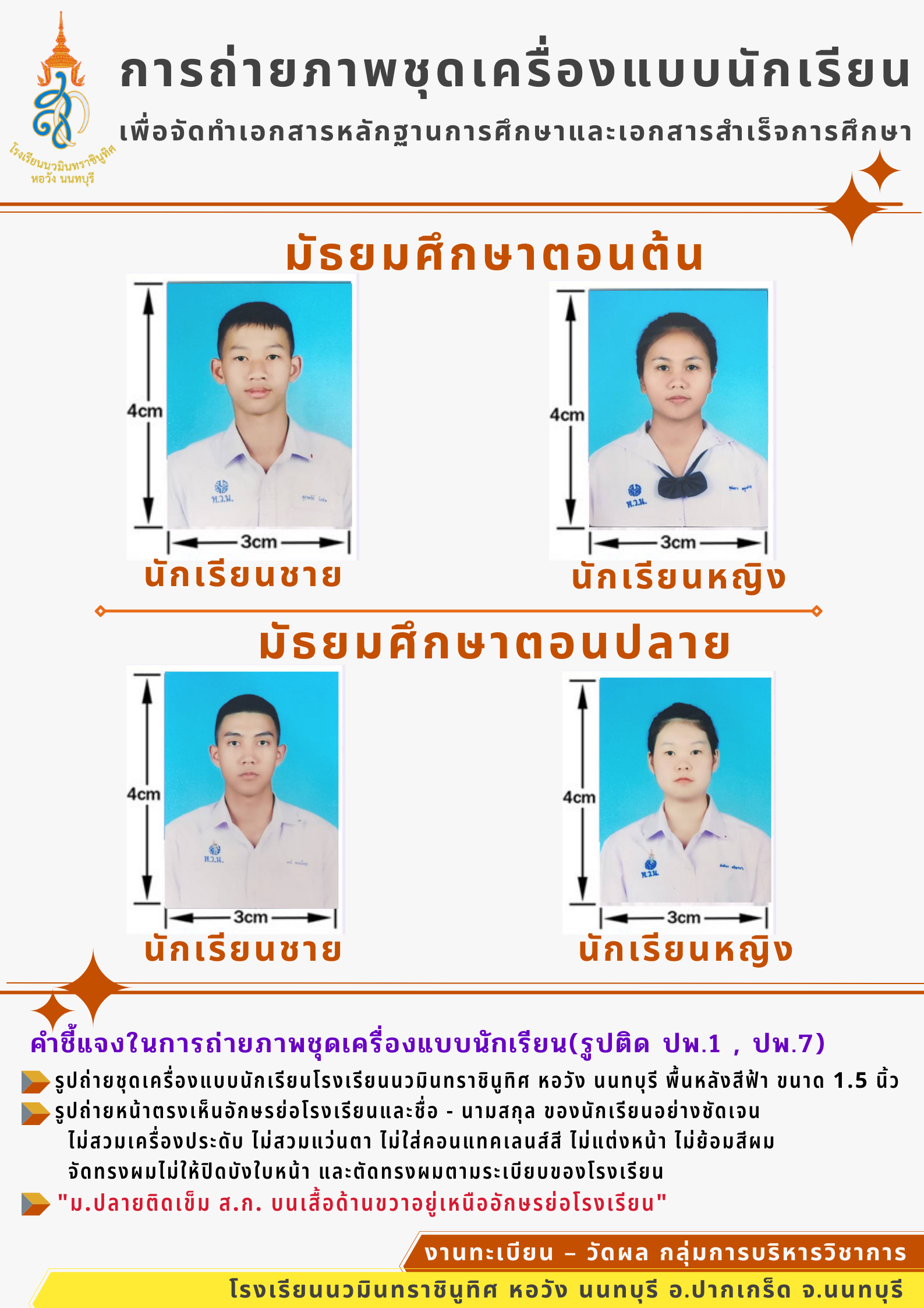 รูปถ่ายหน้าตรงเห็นอักษรย่อโรงเรียนและชื่อ - นามสกุล ของนักเรียนอย่างชัดเจน ไม่สวมเครื่องประดับ ไม่สวมแว่นตา ไม่ใส่คอนแทคเลนส์สี ไม่แต่งหน้า ไม่ย้อมสีผม จัดทรงผมไม่ให้ปิดบังใบหน้า และตัดทรงผมตามระเบียบของโรงเรียน
