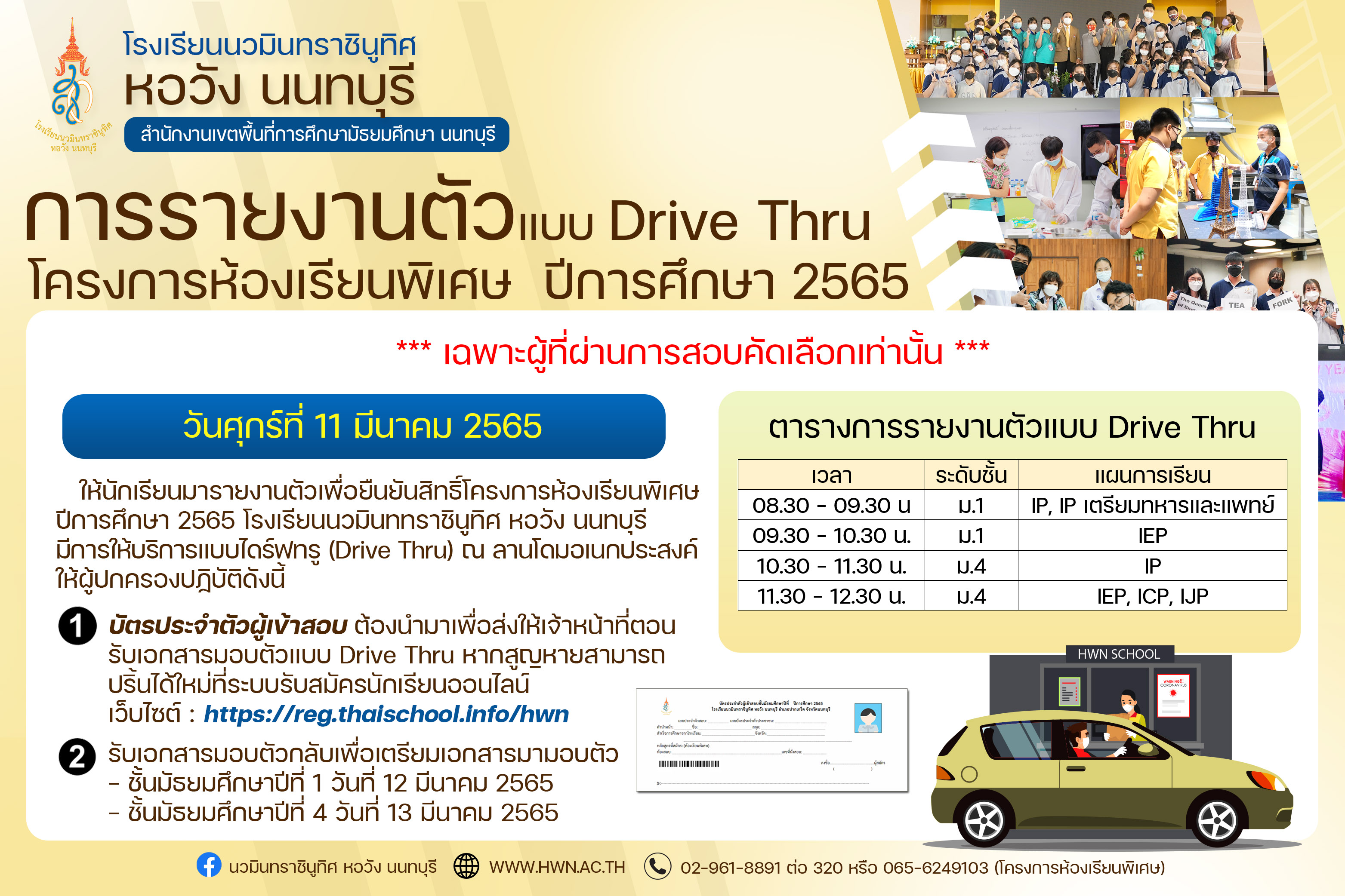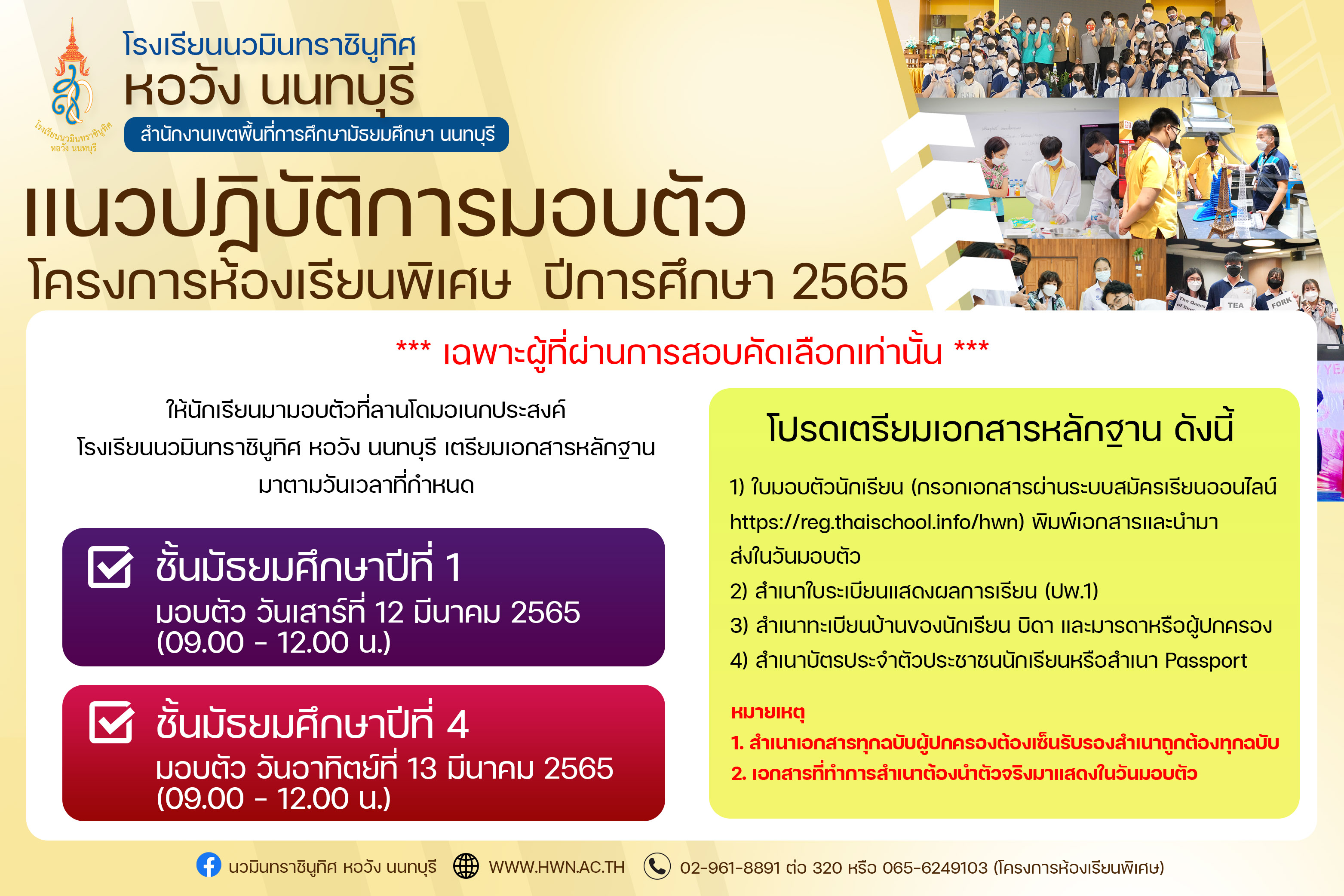 ตามที่โรงเรียนนวมินทราชินูทิศ หอวัง นนทบุรี ได้ประกาศเรื่อง การรับสมัครสอบคัดเลือกเข้าศึกษาต่อ ระดับชั้นมัธยมศึกษาปีที่ 1 และ 4 โครงการห้องเรียนพิเศษ ปีการศึกษา 2565 นั้น