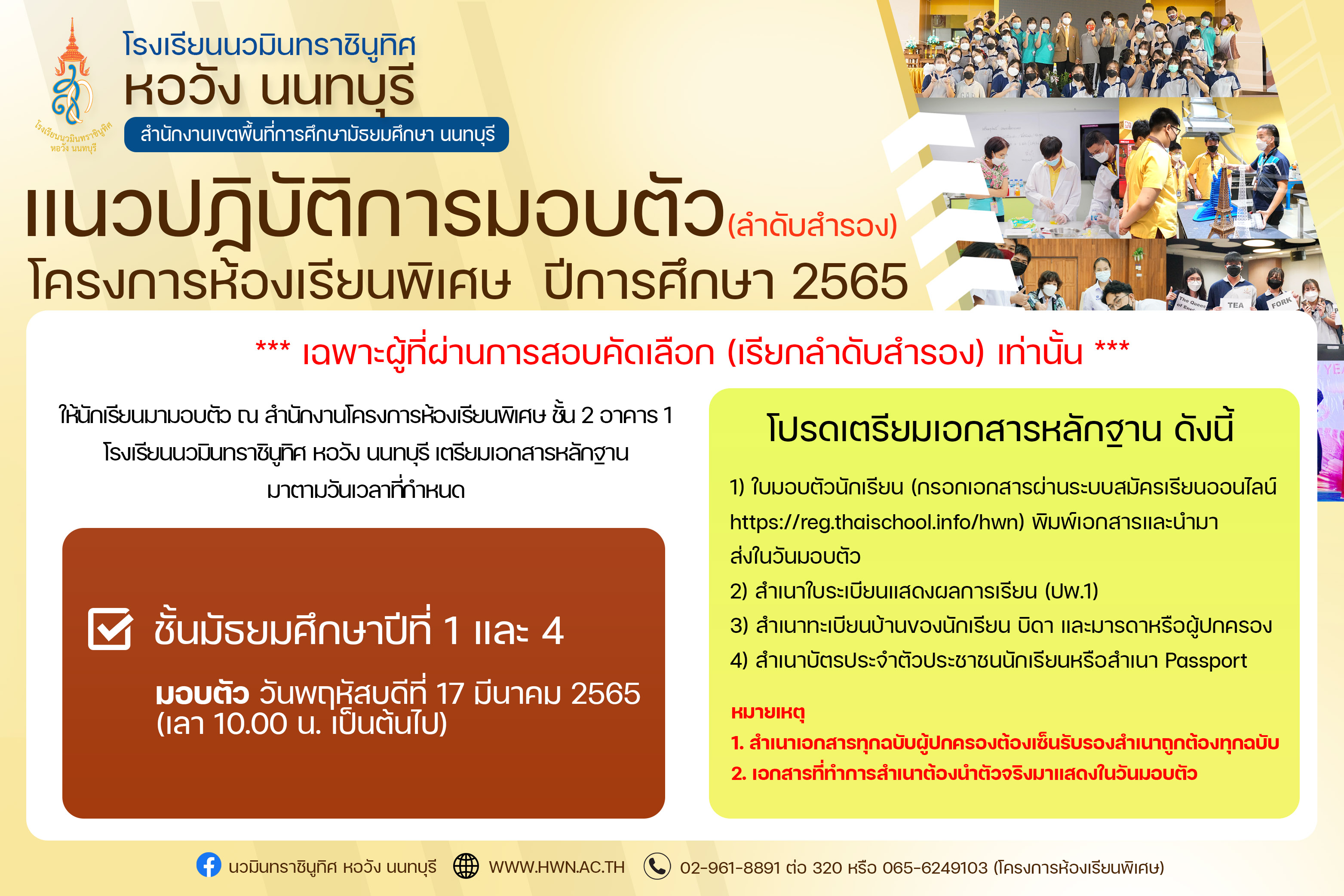 ตามที่โรงเรียนนวมินทราชินูทิศ หอวัง นนทบุรี ได้ประกาศเรื่อง รายชื่อนักเรียนที่ผ่านเกณฑ์การคัดเลือกเข้าศึกษาต่อปีการศึกษา 2565 โครงการห้องเรียนพิเศษ ในวันที่ 10 มีนาคม 2565 และมอบตัวไปแล้วนั้น มีนักเรียนสละสิทธิ์ จึงประกาศเรียกนักเรียนในลำดับสำรองให้มารายงานตัวและมอบตัวตามวันเวลาที่กำหนด ดังนี้