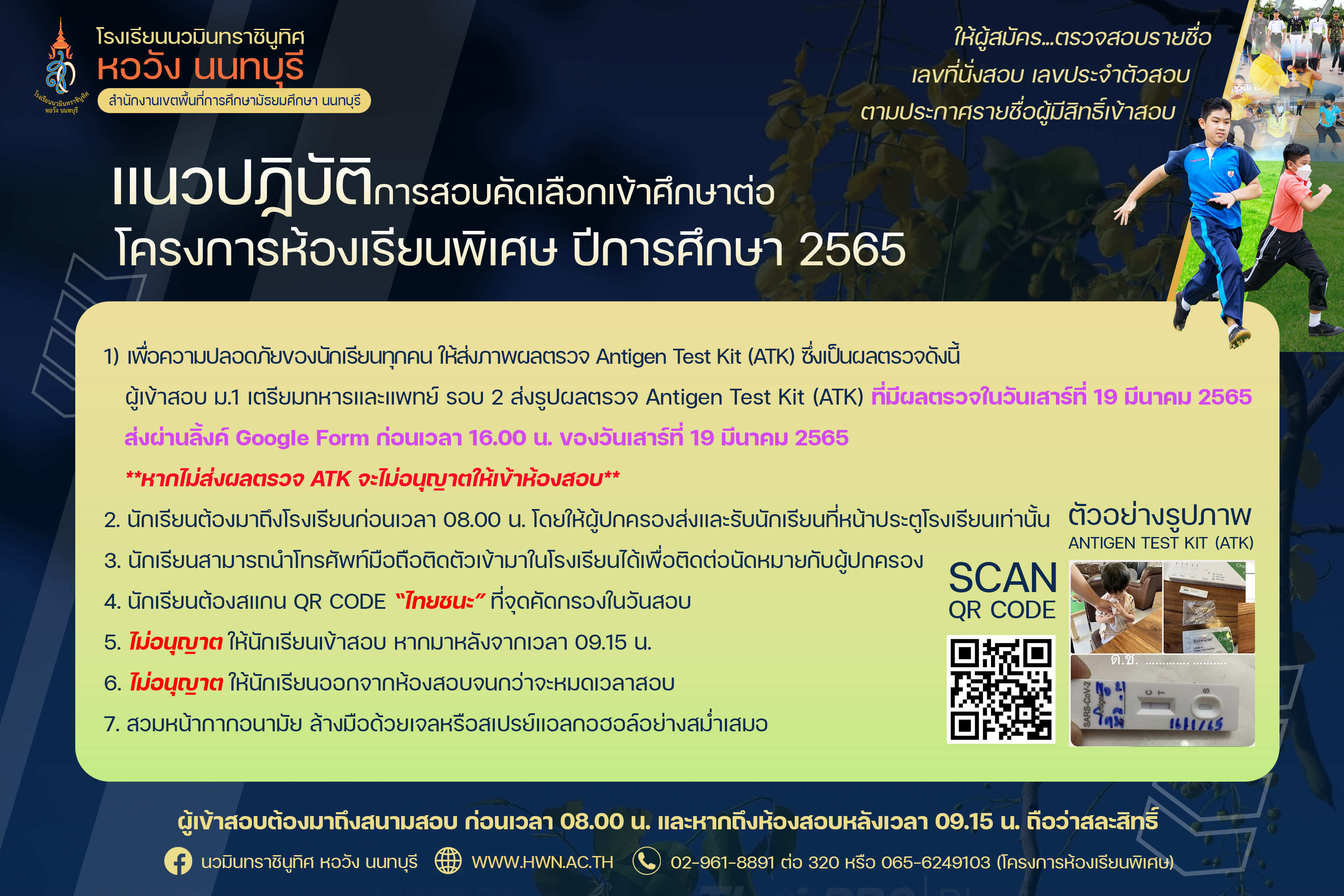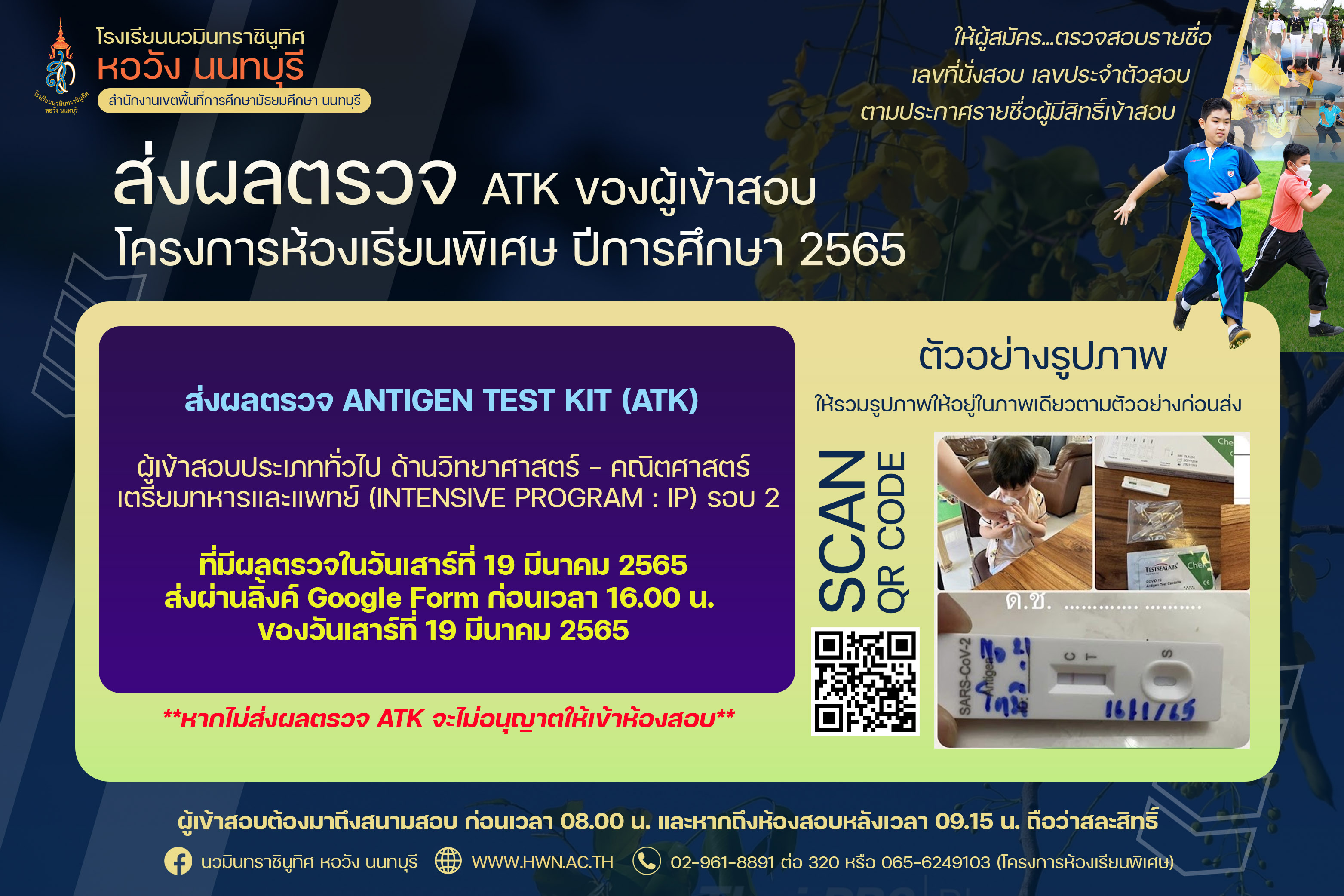 1.3 นักเรียนผู้มีสิทธิ์สอบระดับมัธยมศึกษาปีที่ 1 ส่งรูปผลตรวจ ATK (Antigen Test Kit) เป็นผลตรวจของวันศุกร์ที่ 19 มีนาคม พ.ศ. 2565 ก่อนเวลา 16.00 น. ผ่านลิ้งค์ Google Form หากไม่ส่งผลตรวจตามวัน เวลาที่กำหนดจะไม่อนุญาตให้เข้าทดสอบ