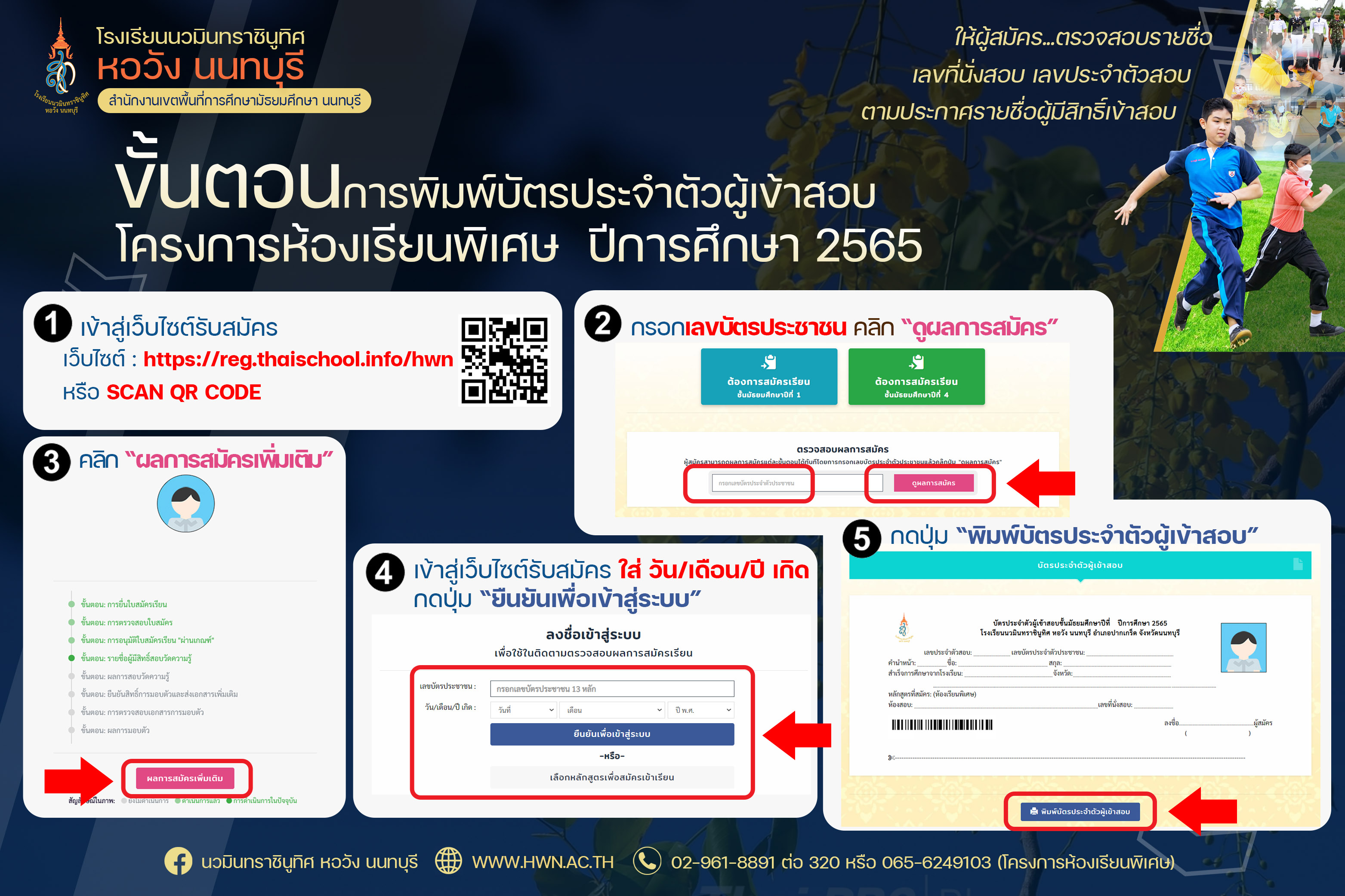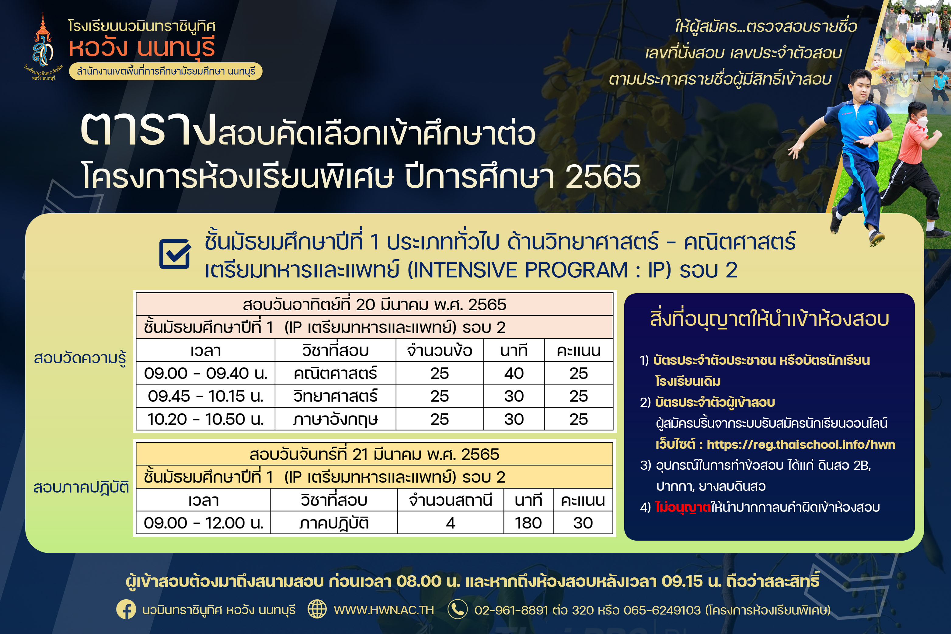 ตามที่โรงเรียนนวมินทราชินูทิศ หอวัง นนทบุรี ได้ประกาศเรื่อง การรับสมัครสอบคัดเลือกเข้าเรียนโครงการห้องเรียนพิเศษ ปีการศึกษา 2565 ระดับชั้นมัธยมศึกษาปีที่ 1 (รอบ 2) โครงการห้องเรียนพิเศษ แผนการเรียนวิทยาศาสตร์ - คณิตศาสตร์ เตรียมทหารและแพทย์ (Intensive Program : IP เตรียมทหารและแพทย์) นั้น จึงขอประกาศรายชื่อผู้มีสิทธิ์สอบคัดเลือกเข้าศึกษาต่อระดับชั้นมัธยมศึกษาปีที่ 1(รอบ 2) โครงการห้องเรียนพิเศษ โรงเรียนนวมินทราชินูทิศ หอวัง นนทบุรี ปีการศึกษา 2565 โครงการห้องเรียนพิเศษระดับชั้นมัธยมศึกษาปีที่ 1 แผนการเรียนวิทยาศาสตร์ - คณิตศาสตร์ เตรียมทหารและแพทย์ (Intensive Program : IP เตรียมทหารและแพทย์) ตามรายละเอียดแนบท้ายประกาศนี้ ให้นักเรียนที่มีรายชื่อดังกล่าวปฏิบัติดังนี้