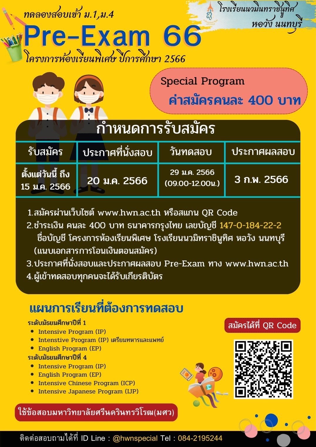 3. ประกาศที่นั่งสอบ Pre-Exam วันที่ 20 มกราคม 2566 ทาง www.hwn.ac.th