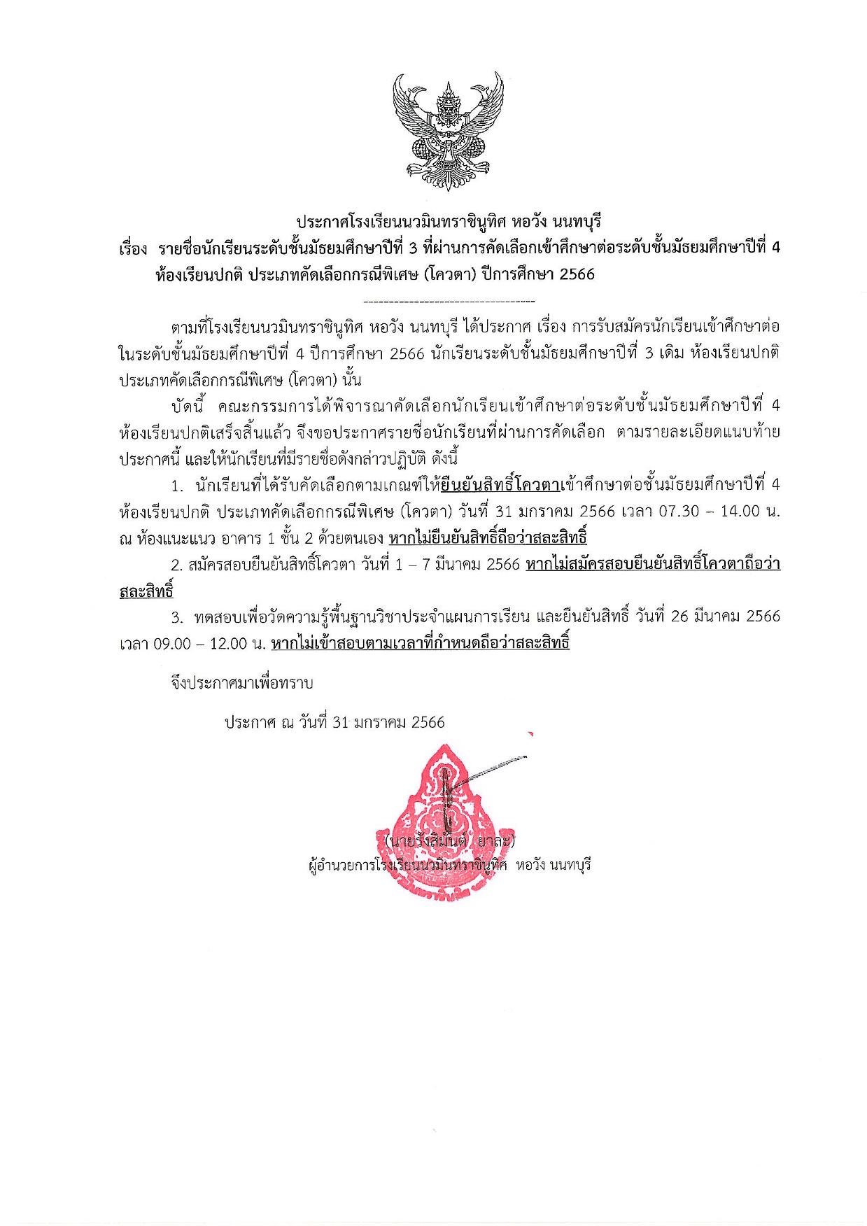 ตามที่โรงเรียนนวมินทราชินูทิศ หอวัง นนทบุรี ได้ประกาศ เรื่อง การรับสมัครนักเรียนเข้าศึกษาต่อ ในระดับชั้นมัธยมศึกษาปีที่ 4 ปีการศึกษา 2566 นักเรียนระดับชั้นมัธยมศึกษาปีที่ 3 เดิม ห้องเรียนปกติ ประเภทคัดเลือกกรณีพิเศษ (โควตา) นั้น