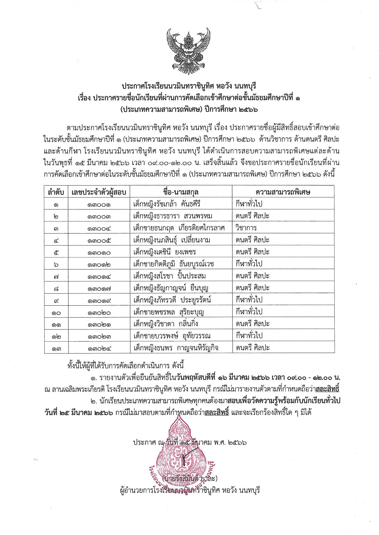 2. นักเรียนประเภทความสามารถพิเศษทุกคนต้องมาสอบเพื่อวัดความรู้พร้อมกับนักเรียนทั่วไป วันที่ 25 มีนาคม 2566 กรณีไม่มาสอบตามที่กำหนดถือว่าสละสิทธิ์ และจะเรียกร้องสิทธิ์ใด ๆ มิได้