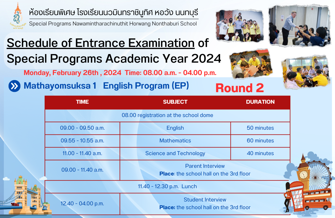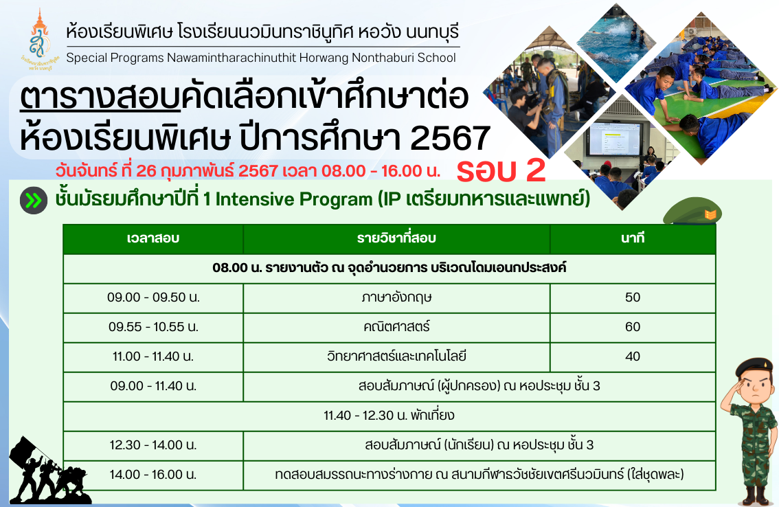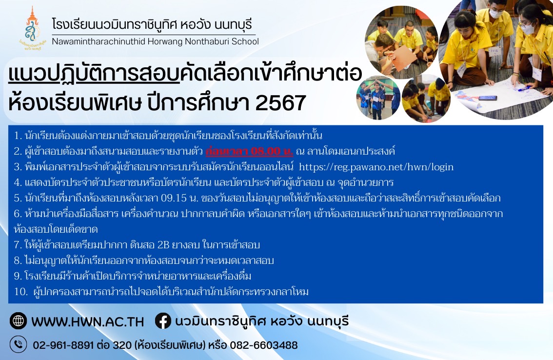 ตามที่โรงเรียนนวมินทราชินูทิศ หอวัง นนทบุรี ได้ประกาศเรื่อง การรับสมัครสอบคัดเลือกเข้าศึกษาต่อโครงการห้องเรียนพิเศษระดับชั้นมัธยมศึกษาปีที่ 1 (เพิ่มเติม) จึงขอประกาศรายชื่อผู้มีสิทธิ์สอบคัดเลือกเข้าศึกษาต่อระดับชั้นมัธยมศึกษาปีที่ 1 โครงการห้องเรียนพิเศษ ปีการศึกษา 2567 โรงเรียนนวมินทราชินูทิศ หอวัง นนทบุรี (เพิ่มเติม) ห้องเรียนพิเศษวิทยาศาสตร์ คณิตศาสตร์ เตรียมทหารและแพทย์ (Intensive Program : IP เตรียมทหารและแพทย์) ห้องเรียนพิเศษภาษาอังกฤษ (English Program : EP) ตามรายละเอียดแนบท้ายประกาศนี้ ให้นักเรียนที่มีรายชื่อดังกล่าวปฏิบัติดังนี้