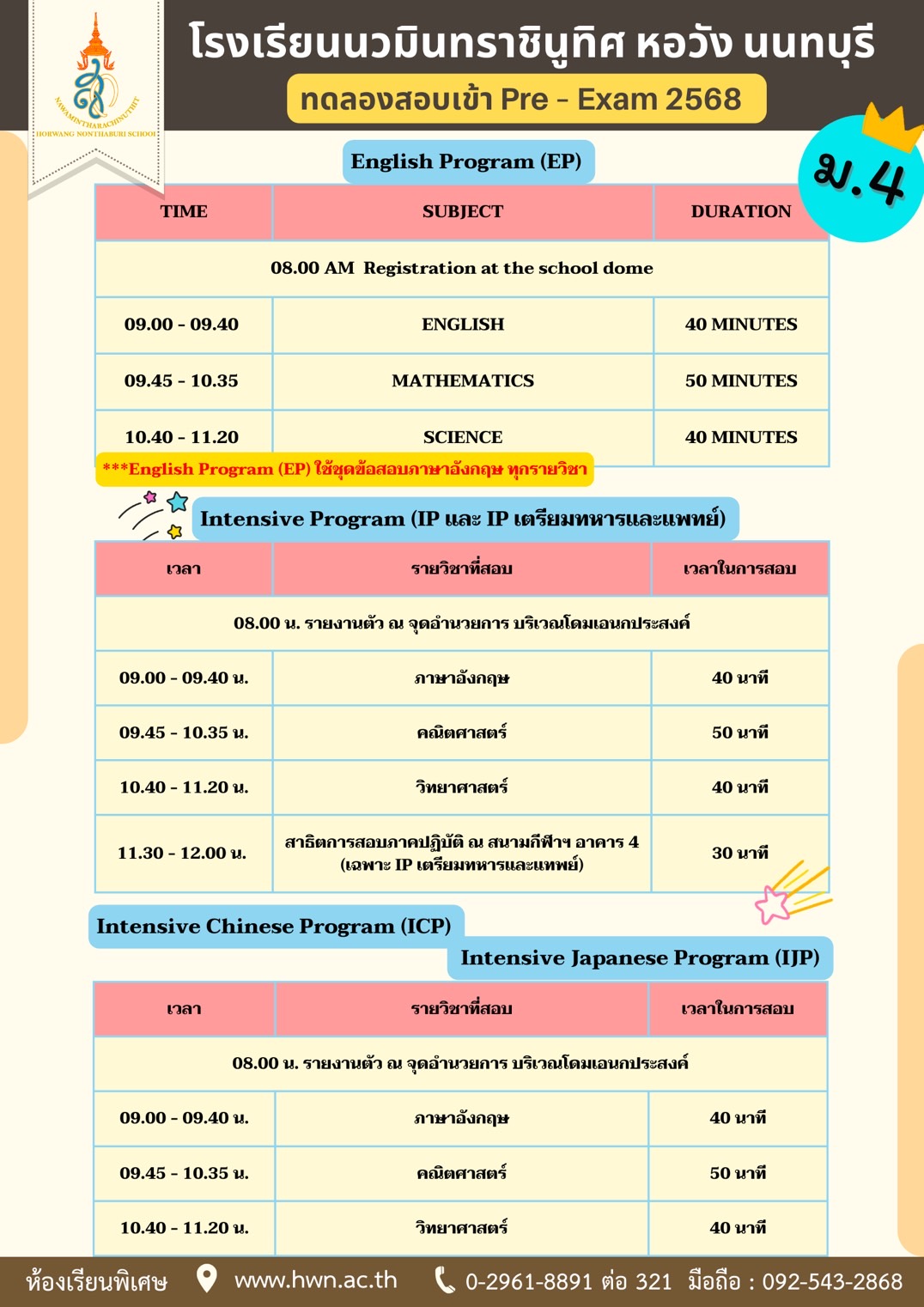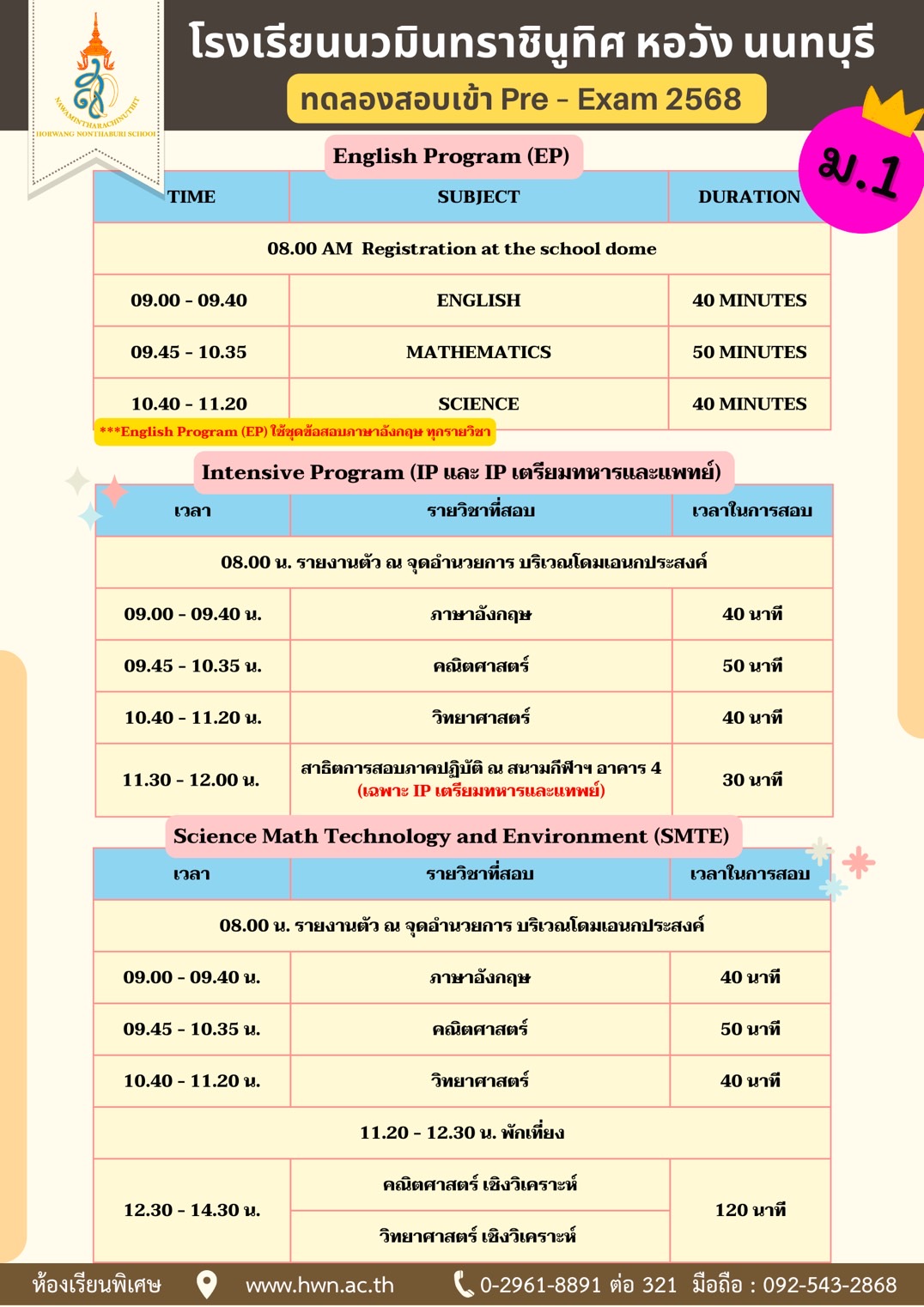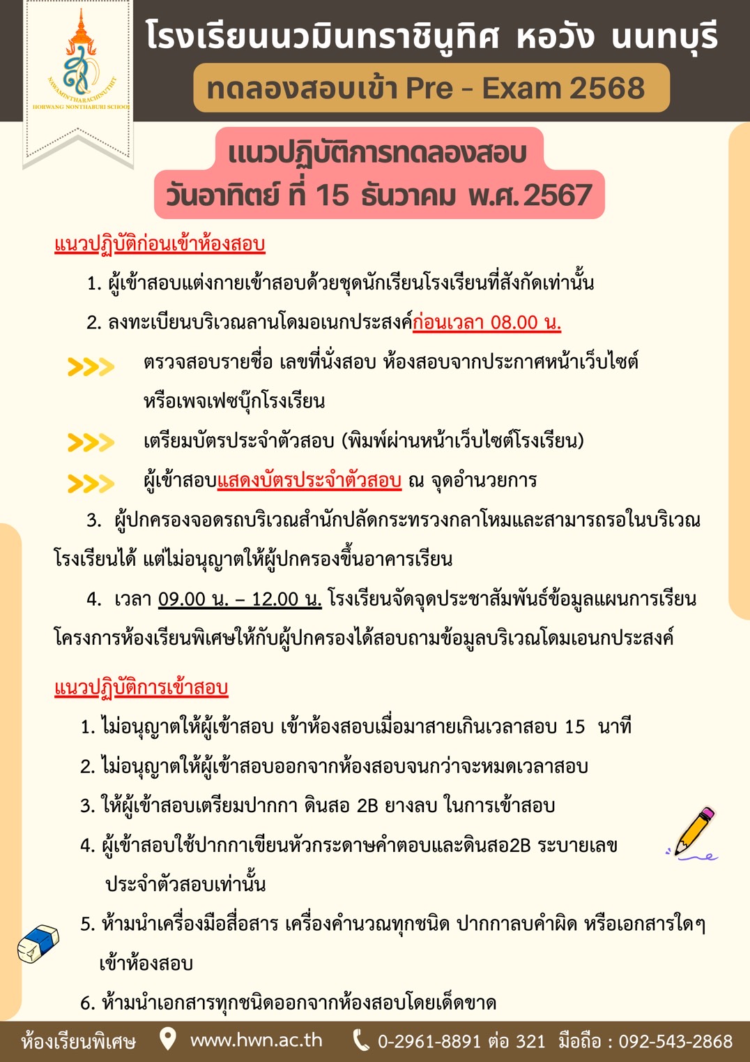 ประกาศเลขที่นั่งสอบ Pre - Exam'68 "ทดลองสอบเข้า ม.1,ม.4" โครงการห้องเรียนพิเศษ ปีการศึกษา 2568