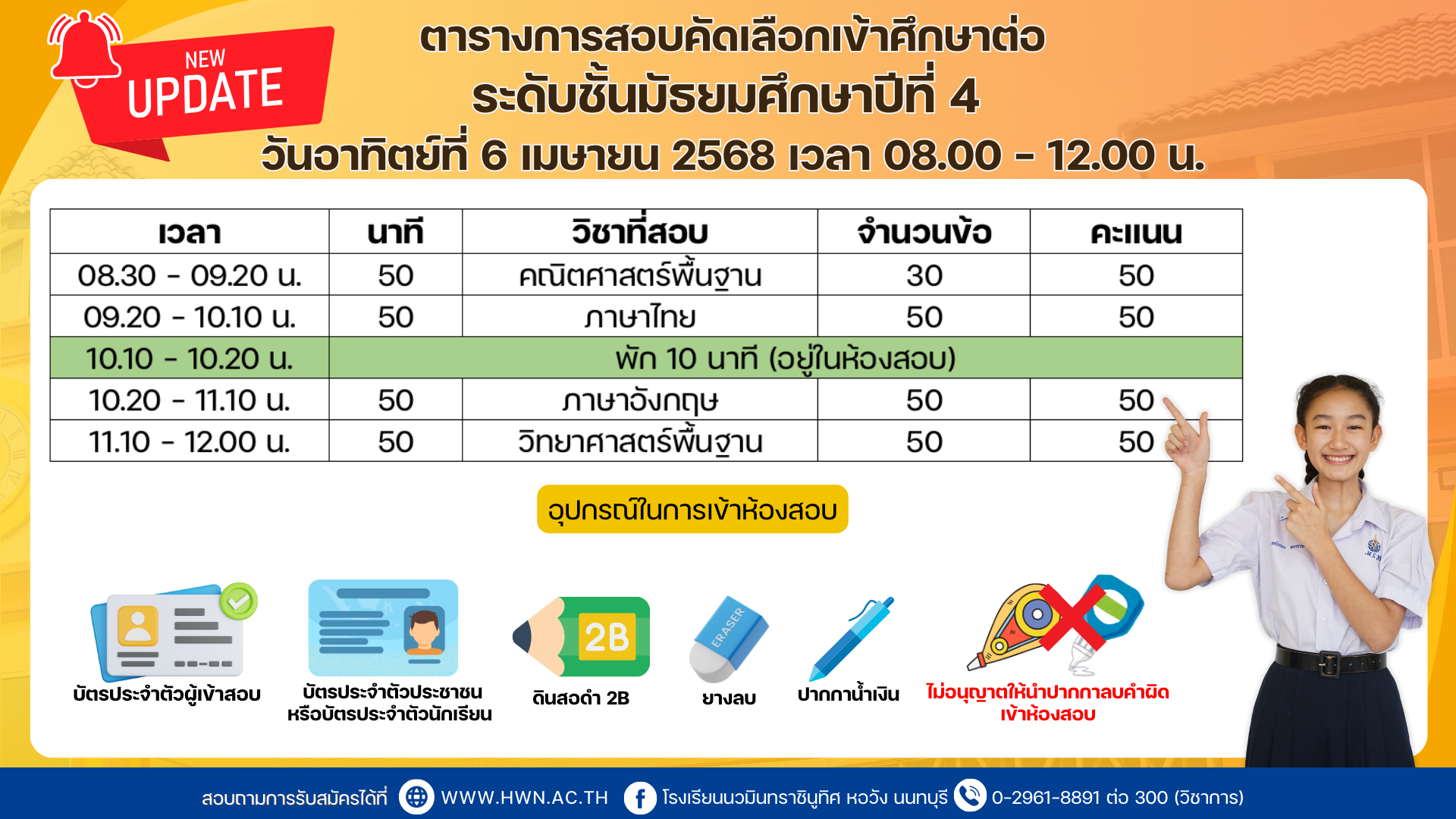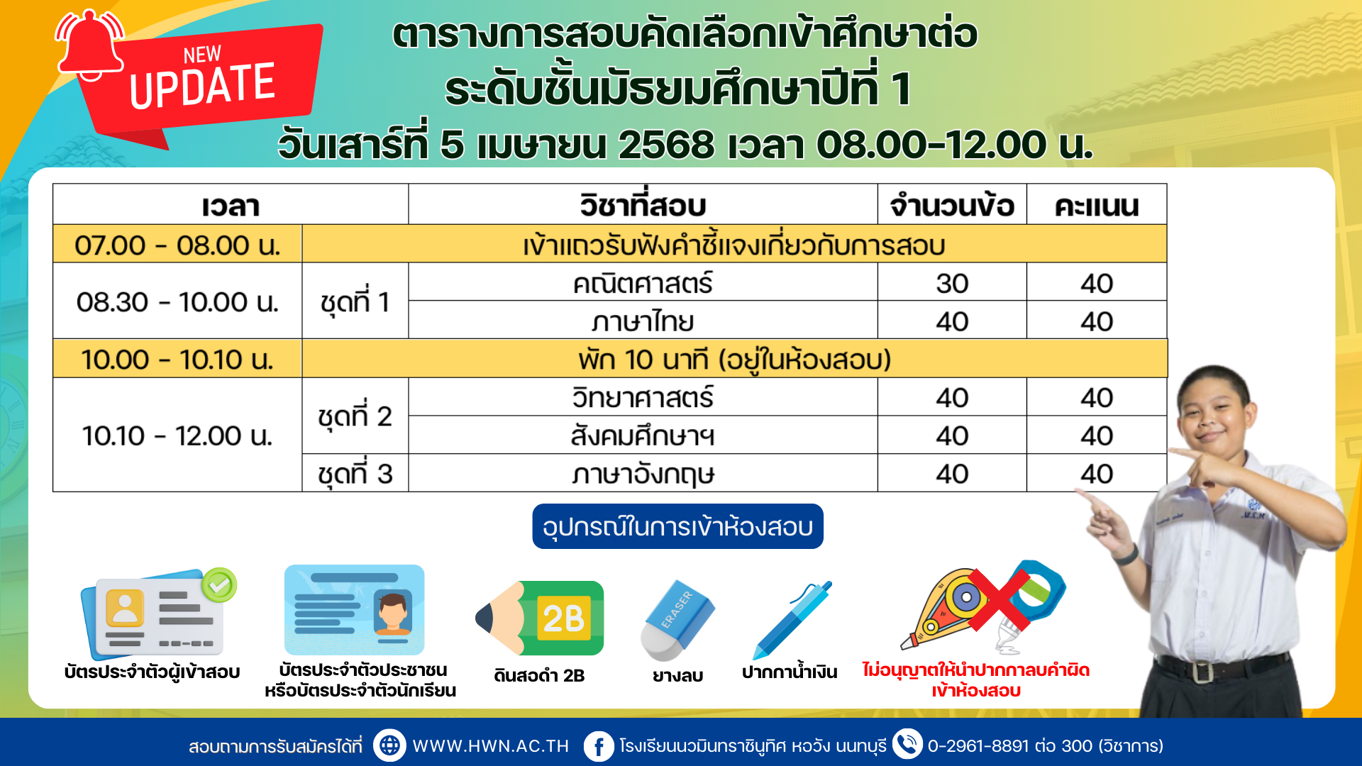 ตามที่โรงเรียนนวมินทราชินูทิศ หอวัง นนทบุรี ได้ประกาศ เรื่อง การรับนักเรียนชั้นมัธยมศึกษาปีที่ 1 และชั้นมัธยมศึกษาปีที่ 4 ปีการศึกษา 2568 นั้น บัดนี้การรับสมัครเสร็จสิ้นแล้ว จึงขอประกาศรายชื่อผู้มีสิทธิ์สอบคัดเลือกเข้าศึกษาต่อระดับชั้นมัธยมศึกษาปีที่ 1 และระดับชั้นมัธยมศึกษาปีที่ 4 ห้องเรียนปกติ โรงเรียนนวมินทราชินูทิศ หอวัง นนทบุรี ปีการศึกษา 2568 ตามรายละเอียดแนบท้ายประกาศนี้ให้นักเรียนที่มีรายชื่อดังกล่าวปฏิบัติดังนี้