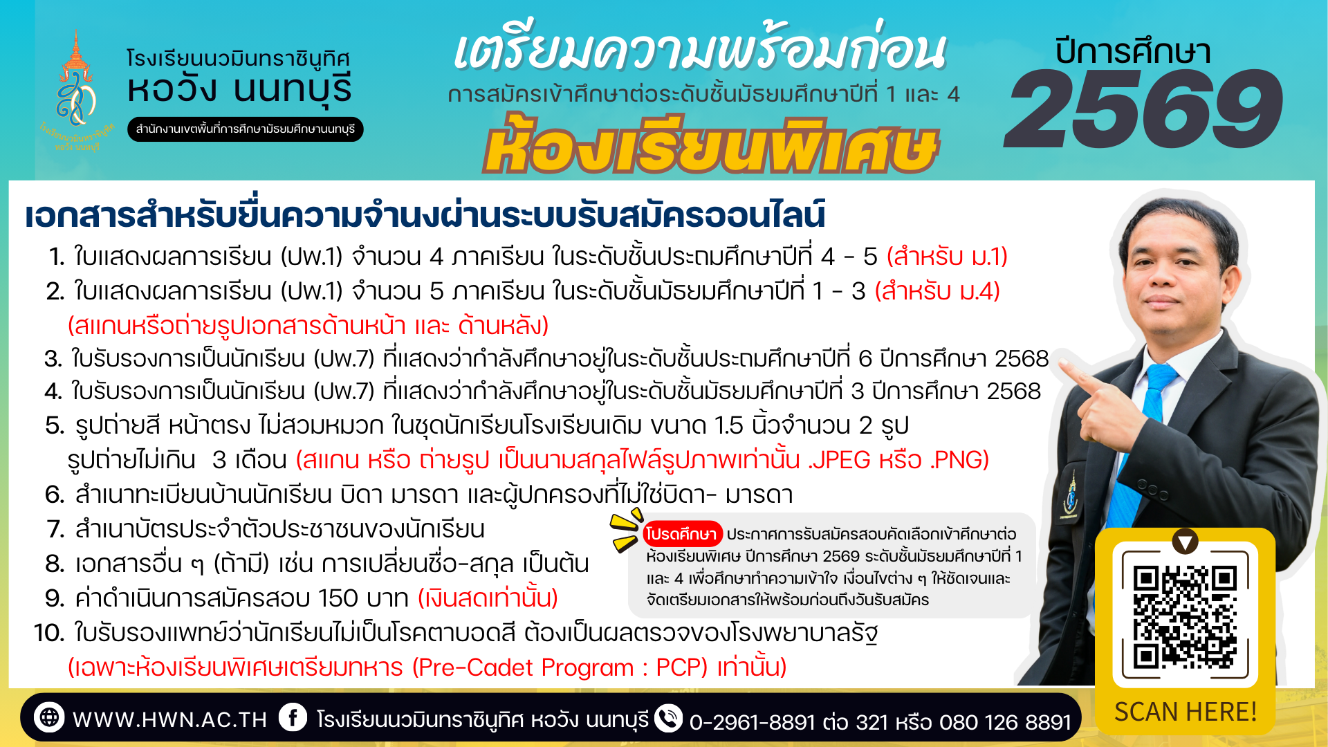 กระทรวงศึกษาธิการได้กำหนดนโยบายให้สำนักงานคณะกรรมการการศึกษาขั้นพื้นฐานอนุญาตให้สถานศึกษาขั้นพื้นฐานในสังกัดเปิดห้องเรียนพิเศษ เพื่อพัฒนาศักยภาพให้แก่นักเรียนที่มีความสามารถด้านวิทยาศาสตร์ คณิตศาสตร์ ภาษาอังกฤษ ภาษาจีนและภาษาญี่ปุ่น โดยการรับนักเรียนที่มีความสามารถพิเศษ ในด้านดังกล่าวเข้าศึกษาต่อ ประจำปีการศึกษา 2569 โดยแยกจากการรับนักเรียนรอบห้องเรียนปกติ เพื่อให้การดำเนินการเป็นไปด้วยความเรียบร้อย โรงเรียนนวมินทราชินูทิศ หอวัง นนทบุรี สังกัดสำนักงานเขตพื้นที่การศึกษามัธยมศึกษานนทบุรี จึงกำหนดแนวทางการรับนักเรียนห้องเรียนพิเศษชั้นมัธยมศึกษาปีที่ 1 ห้องเรียนพิเศษวิทยาศาสตร์ - คณิตศาสตร์ (Intensive Program : IP) ห้องเรียนพิเศษเตรียมทหาร (Pre-Cadet Program : PCP) ห้องเรียนพิเศษภาษาอังกฤษ (English Program : EP) ห้องเรียนพิเศษวิทยาศาสตร์ คณิตศาสตร์ เทคโนโลยีและสิ่งแวดล้อม (Enrichment Program of Science Mathematics Technology and Environment : SMTE) และ ชั้นมัธยมศึกษาปีที่ 4 ห้องเรียนพิเศษวิทยาศาสตร์ – คณิตศาสตร์ (Intensive Program :IP) ห้องเรียนพิเศษเตรียมทหาร (Pre-Cadet Program : PCP) ห้องเรียนพิเศษภาษาอังกฤษ (English Program : EP) ห้องเรียนพิเศษภาษาจีนและเทคโนโลยี (Intensive Chinese Program : ICP) และห้องเรียนพิเศษภาษาญี่ปุ่นและเทคโนโลยี (Intensive Japanese Program : IJP) ดังนี้