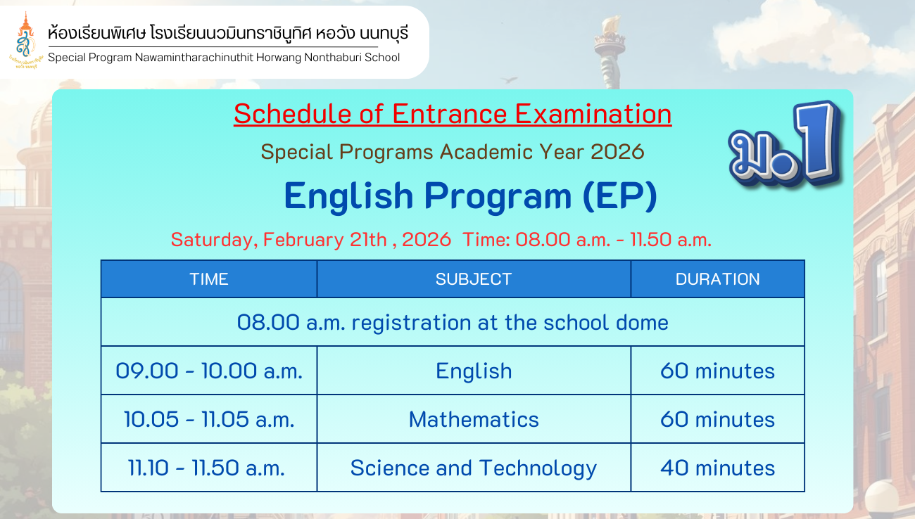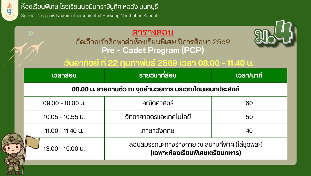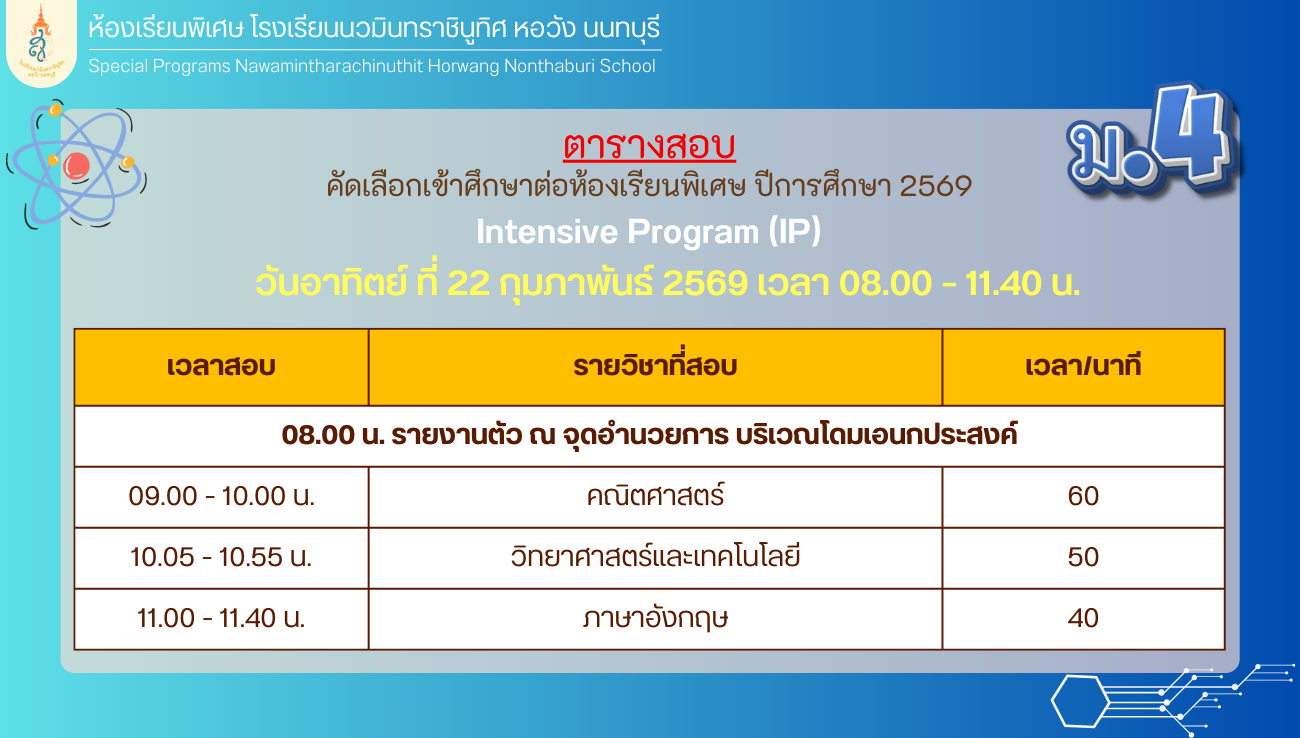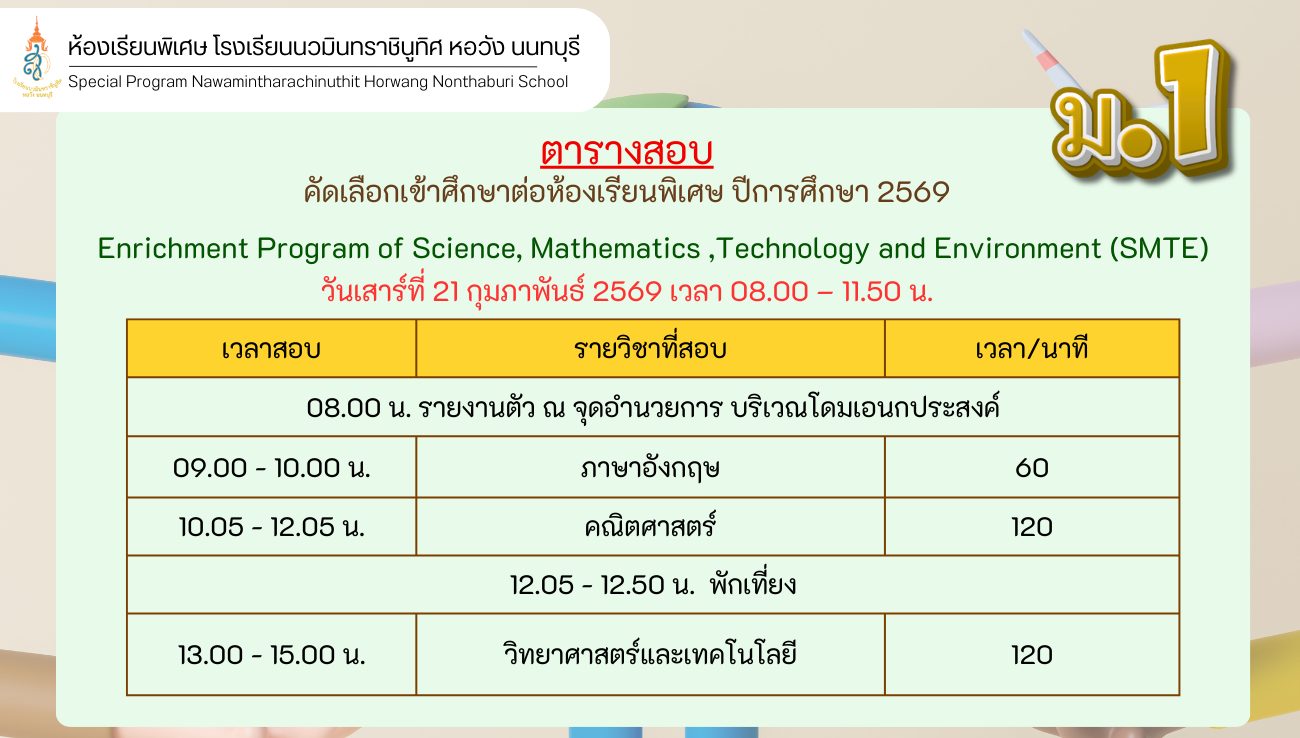 ตารางสอบคัดเลือกเข้าศึกษาต่อห้องเรียนพิเศษ ปีการศึกษา 2569
