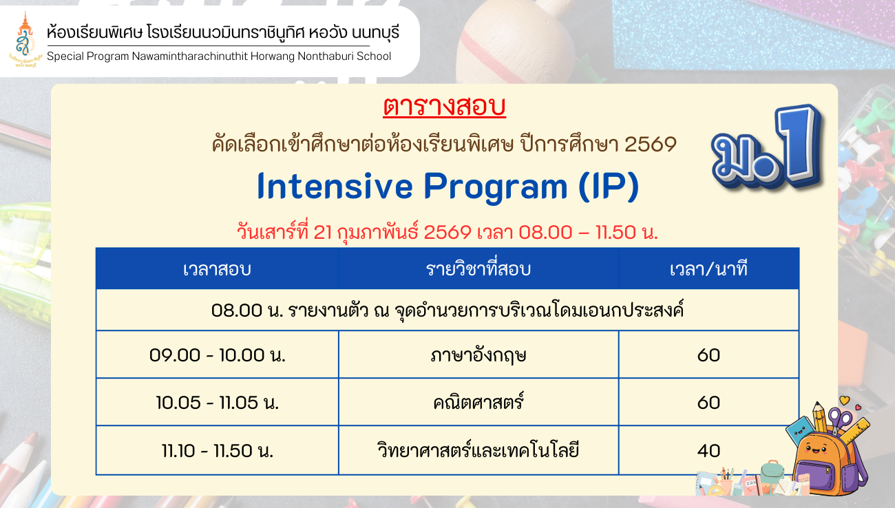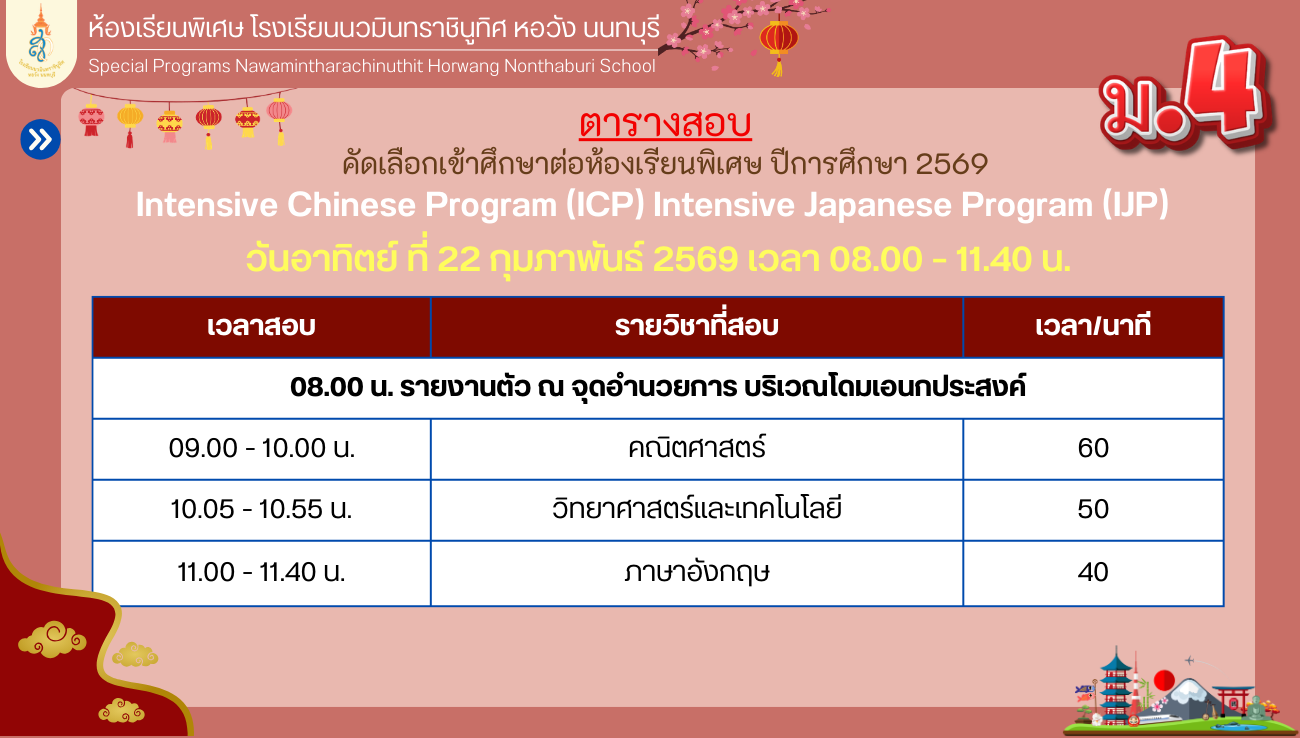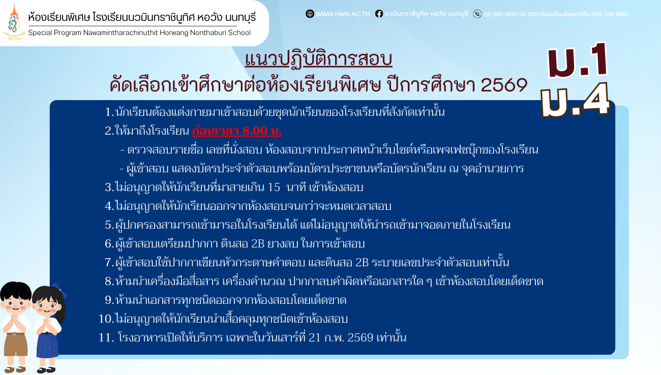 ตามที่โรงเรียนนวมินทราชินูทิศ หอวัง นนทบุรี ได้ประกาศ เรื่อง การรับสมัครสอบคัดเลือกเข้าเรียนโครงการห้องเรียนพิเศษ ปีการศึกษา 2569 ชั้นมัธยมศึกษาปีที่ 1 และ 4 จึงขอประกาศรายชื่อผู้มีสิทธิ์สอบคัดเลือกเข้าศึกษาต่อระดับชั้นมัธยมศึกษาปีที่ 1 และ 4 ห้องเรียนพิเศษ โรงเรียนนวมินทราชินูทิศ หอวัง นนทบุรี ปีการศึกษา 2569 ห้องเรียนพิเศษชั้นมัธยมศึกษาปีที่ 1 และ 4 ห้องเรียนพิเศษวิทยาศาสตร์ คณิตศาสตร์ (Intensive Program : IP) ห้องเรียนพิเศษเตรียมทหาร (Pre-Cadet Program : PCP) ห้องเรียนพิเศษภาษาอังกฤษ (English Program : EP) ห้องเรียนพิเศษวิทยาศาสตร์ คณิตศาสตร์ เทคโนโลยีและสิ่งแวดล้อม (Enrichment Program of Science Mathematics Technology and Environment : SMTE) ห้องเรียนพิเศษภาษาจีน (Intensive Chinese Program : ICP) และห้องเรียนพิเศษภาษาญี่ปุ่น (Intensive Japanese Program : IJP) ตามรายละเอียดแนบท้ายประกาศนี้ ให้นักเรียนที่มีรายชื่อปฏิบัติดังนี้