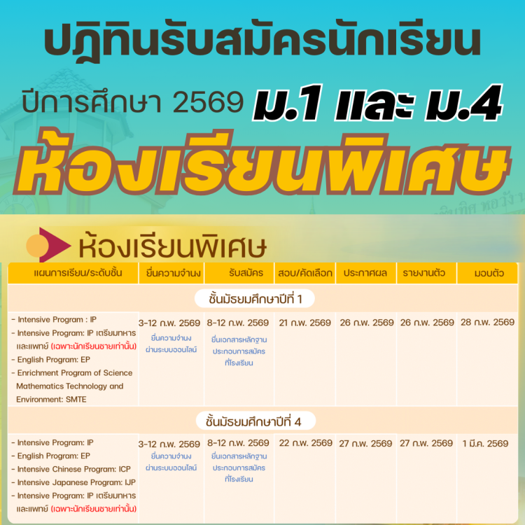 ปฏิทินรับสมัครนักเรียนห้องเรียนพิเศษปีการศึกษา 2569
