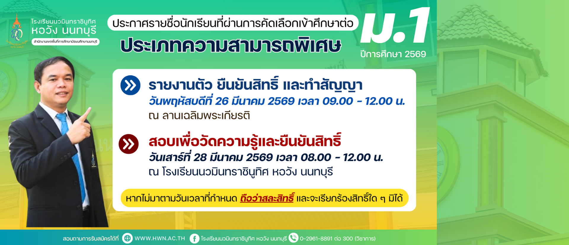 ประกาศ เรื่อง การเปลี่ยนแปลงกำหนดการรับสมัครนักเรียนเข้าศึกษาต่อชั้นมัธยมศึกษาปีที่ 4 ห้องเรียนปกติ ประเภทคัดเลือกกรณีพิเศษ (โควตา) ปีการศึกษา 2569