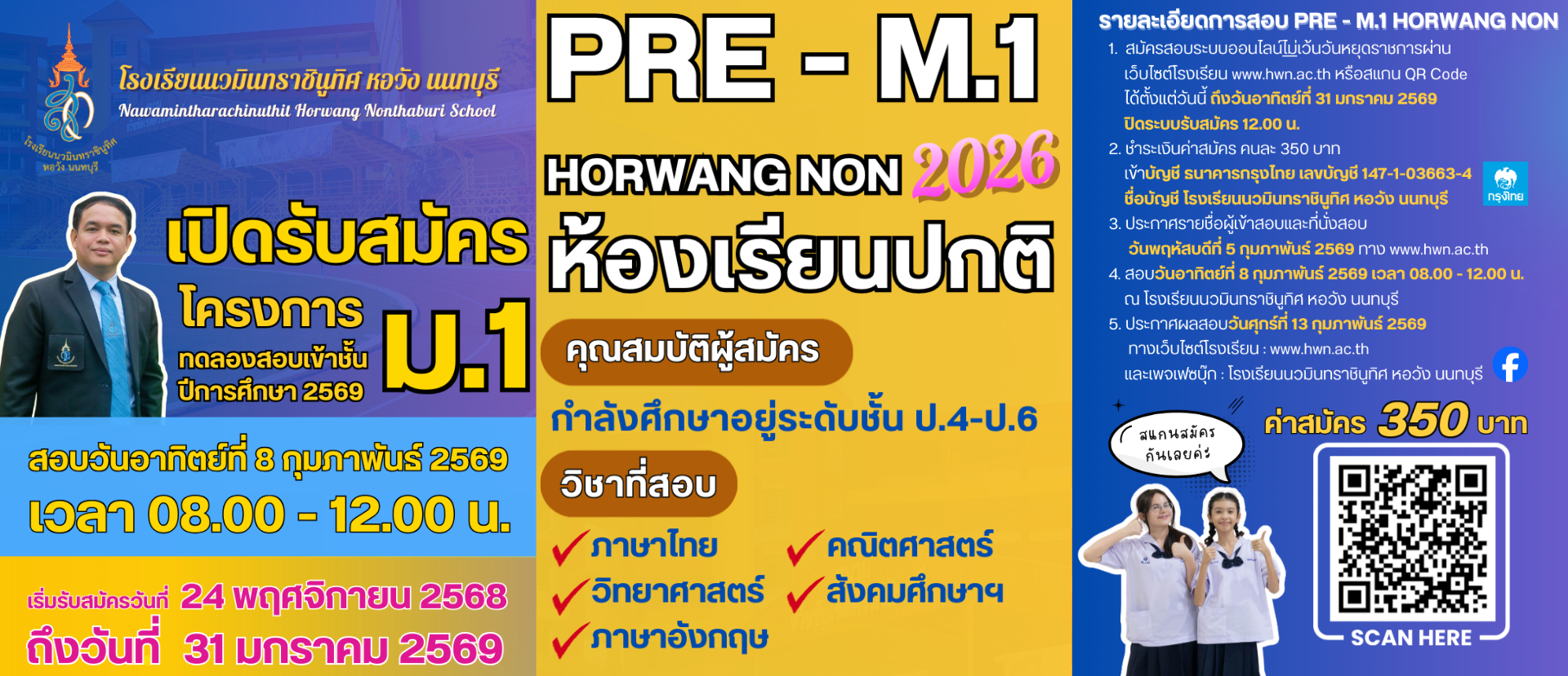 ขอเชิญนักเรียนระดับประถมศึกษาปีที่ 6 สมัครเข้าร่วมการทดสอบ PRE-M.1 ประจำปีการศึกษา 2569 ของโรงเรียนนวมินทราชินูทิศ หอวัง นนทบุรี