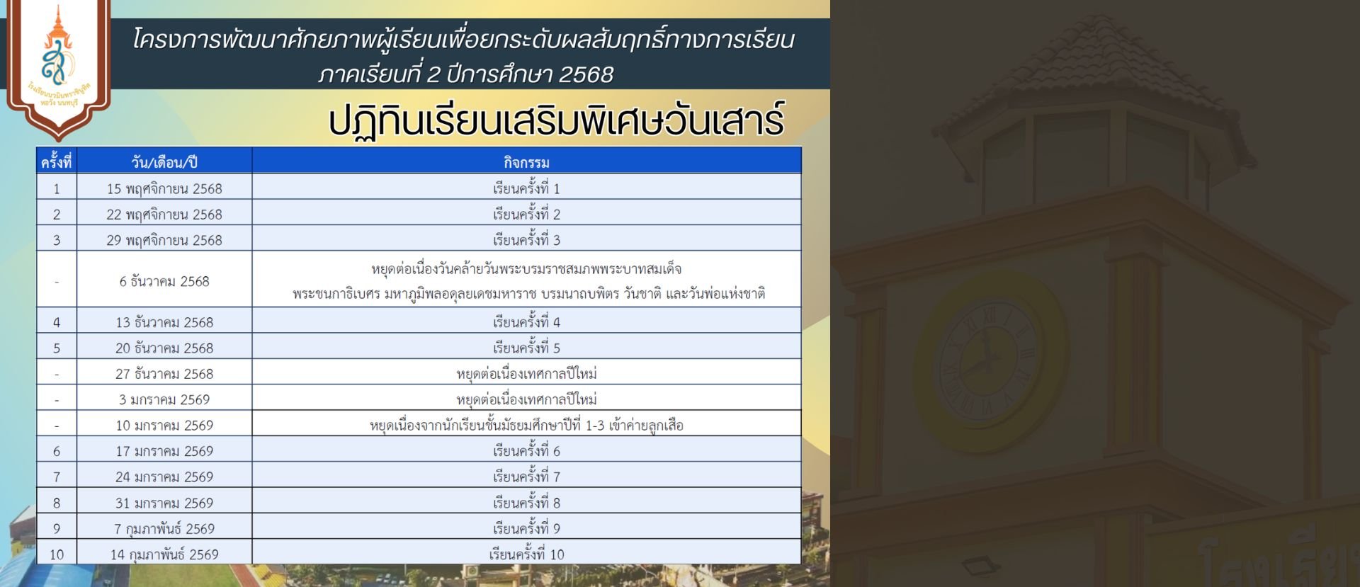 ประกาศรายชื่อนักเรียน ตารางเรียน การเรียนเสริมพิเศษวันเสาร์ ภาคเรียนที่ 2 ปีการศึกษา 2568